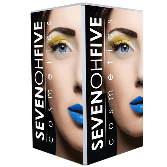 While ideal on tables, adapt Big Sky's four-sided backlit fabric graphics to exhibit hall dynamics by mounting frames at slight upward angles on kiosk counters. This helps project branding to audiences on spacious floors better than tabletop flat positioning.