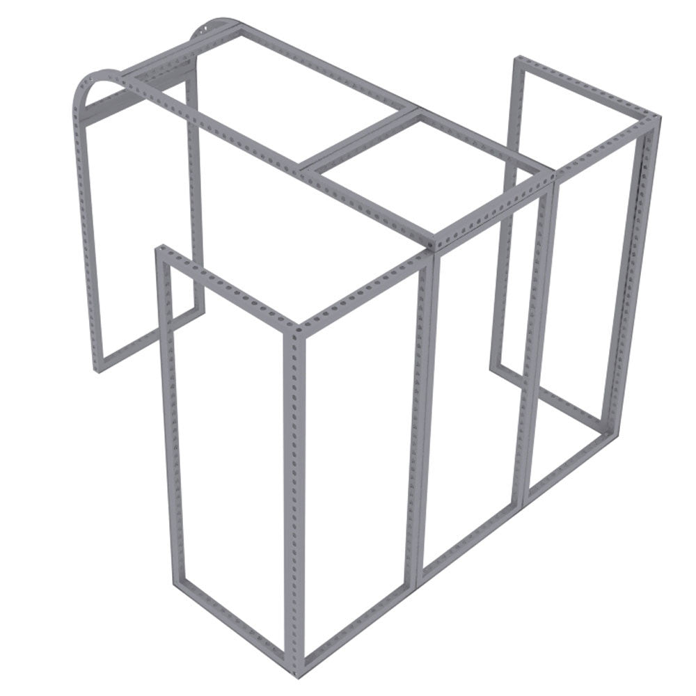 Modco Modular Display 4 is a three-dimensional 10' x 10' pre-designed exhibit booth ideal for a peninsula-style booth space. Stylish and lively, this booth is built using tool-free perforated modular aluminum frames. Multiple size frames connect using toolless pin connectors. Perforations are completely covered for a flawless finish.