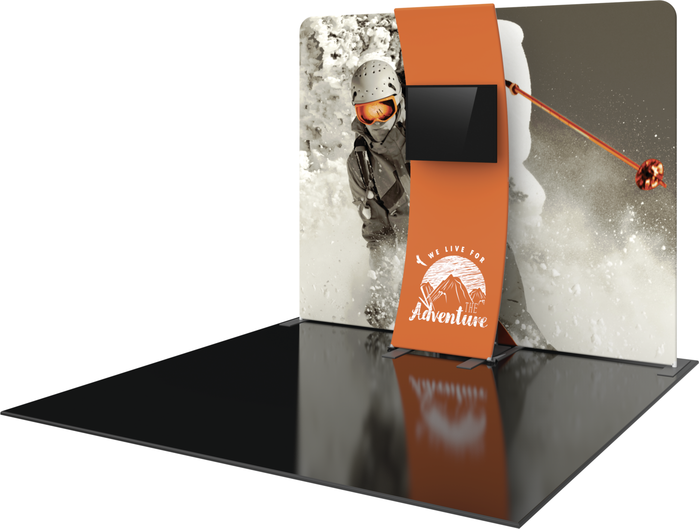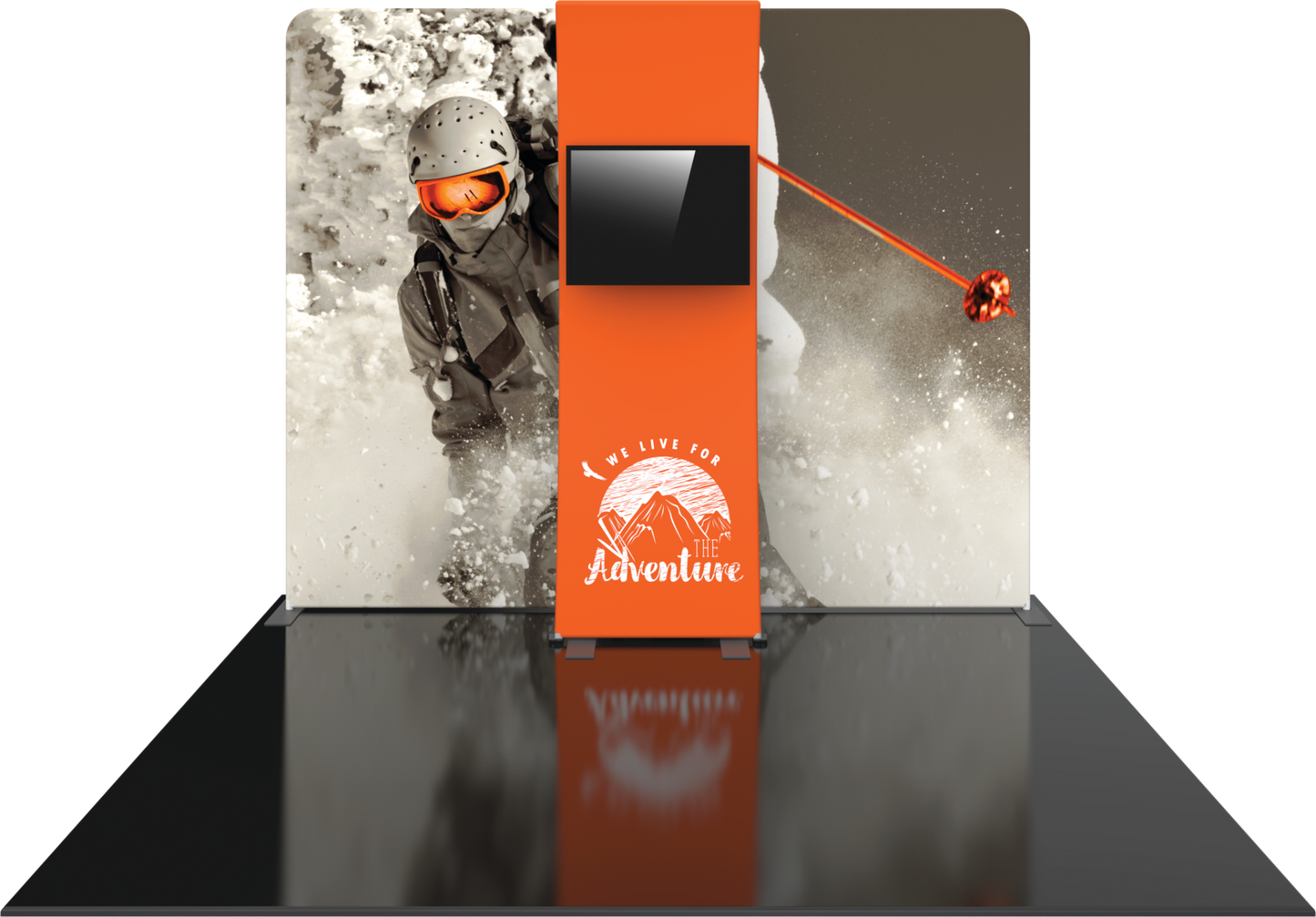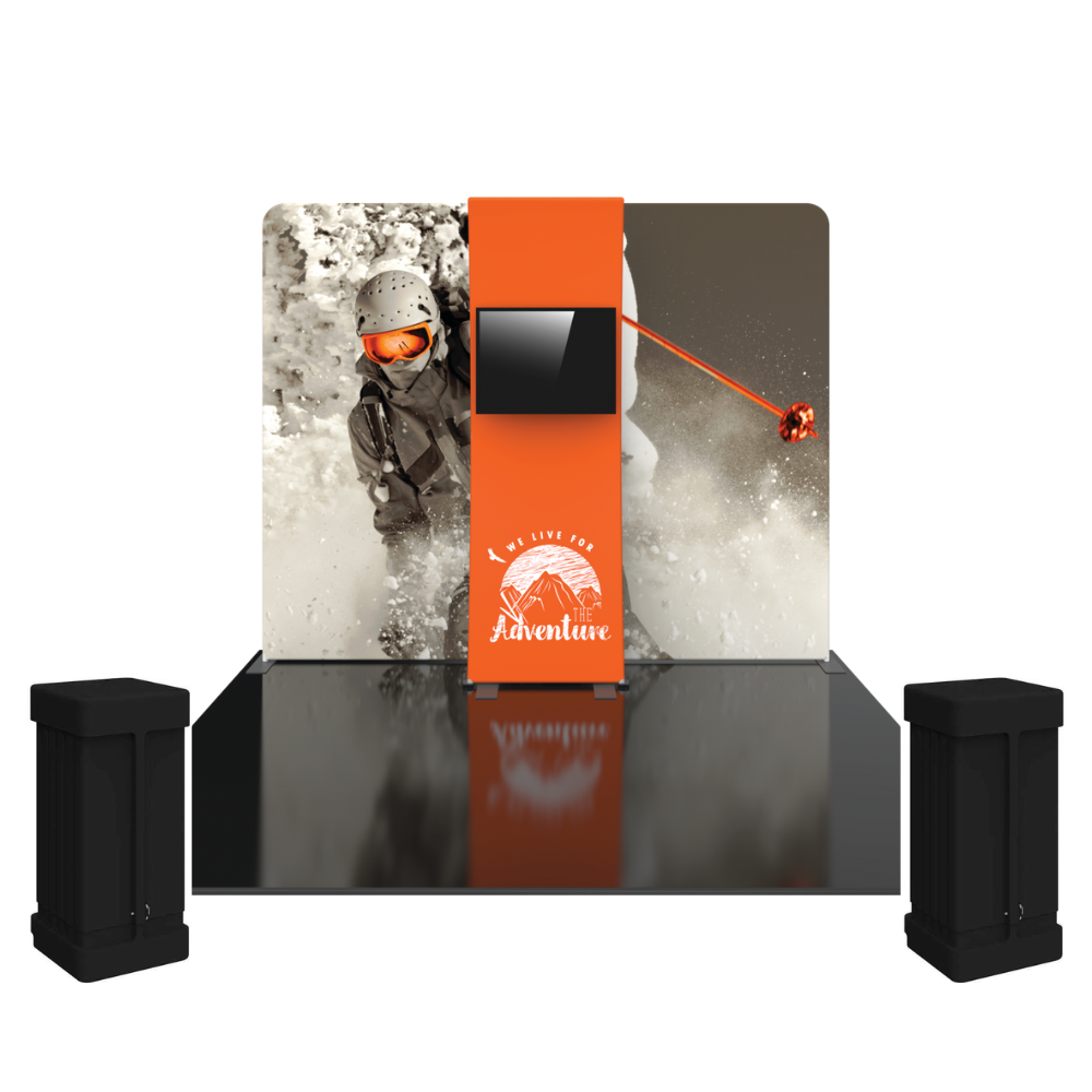 Formulate Designer Series 10ft Fabric backwall Kit 06 is sophisticated and sharp-looking display that includes an aluminum tube frame featuring snap button/spigot connections, and a tubular kiosk supporting a medium monitor mount for multimedia display, and simple pullover zipper pillowcase fabric graphics. Designer Series Kit 06 comes in two portable, expandable wheeled transit cases for easy storage and transport. Assembly and graphic attachment is easy - simply pull the pillowcase fabric graphics over the frame and zip.