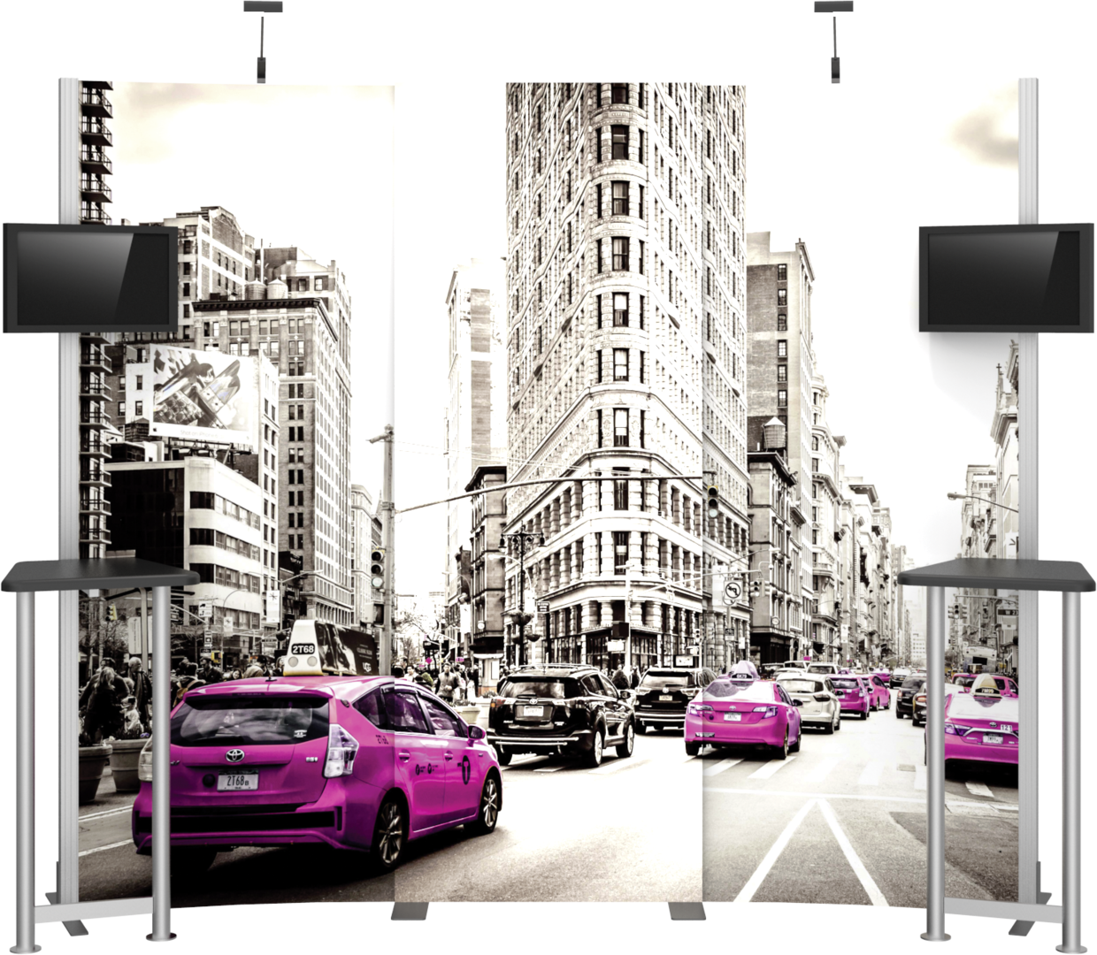 Hybrid Pro™ Modular Kit 01 is an ideal 10ft x 10ft inline display solution for the serious exhibitor. Kit 01 combines heavy-duty aluminum extrusion frames and push-fit SEG fabric graphics for a stylish and finished look. Hybrid Pro Modular Kit 01 features dual monitor mounts, backwall tables, and a backlit center graphic panel to make messaging pop! LED display lighting is included for additional illumination. Count on making an unforgettable impact with Hybrid Pro Modular 10ft x 10ft Kit 01.