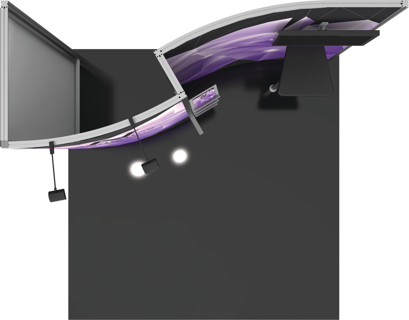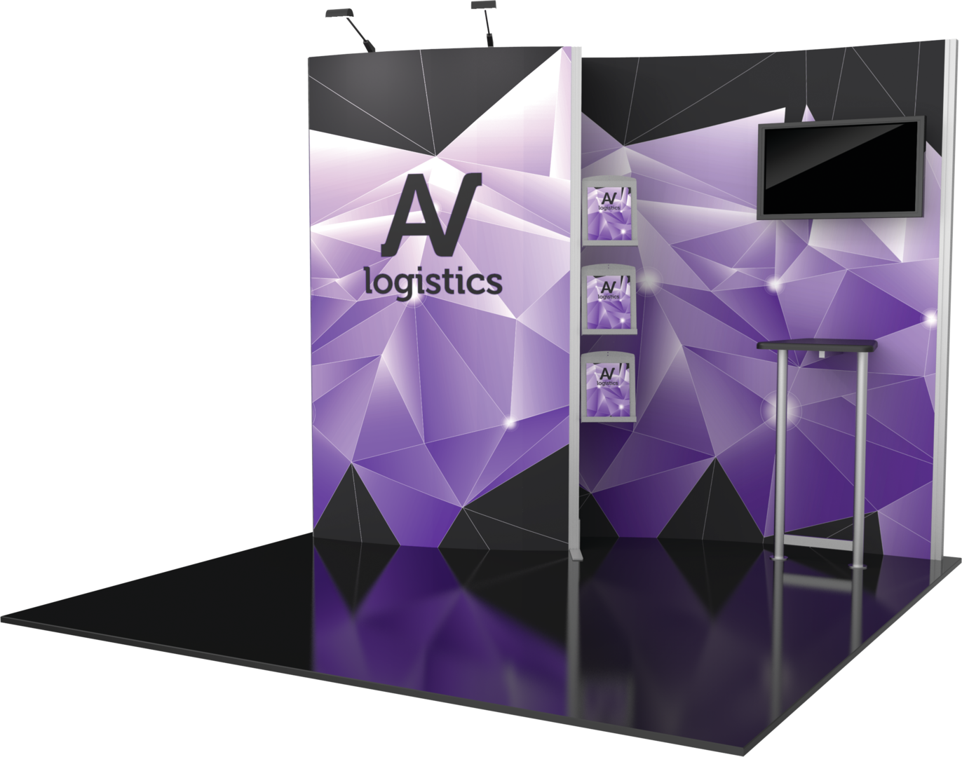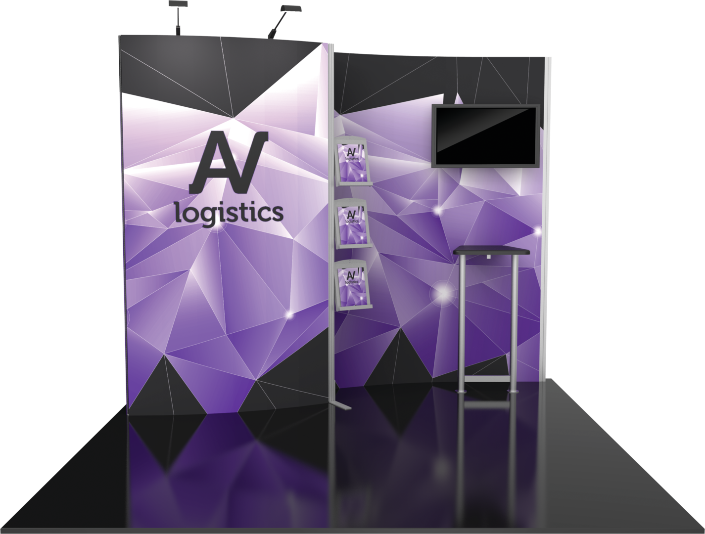 Hybrid Pro™ Modular Kit 02 is an off-the-shelf 10ft x 10ft display kit that creates a stunning display solution. Kit 02 features a monitor mount, literature racks, back wall tables and LED display lighting, combined with durable aluminum frames and high-quality graphics. Customize with additional elements to create a truly remarkable display that leaves a lasting impact.