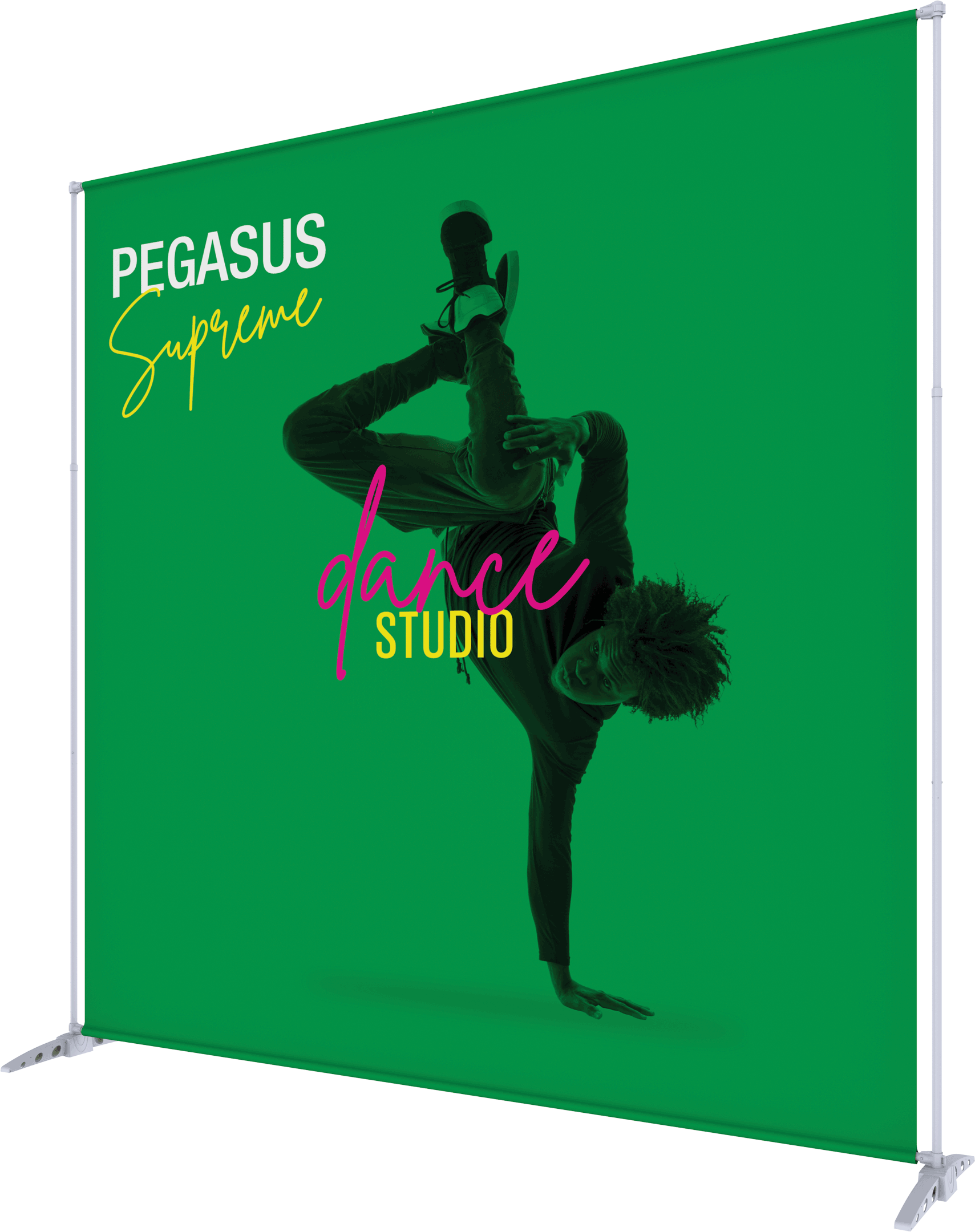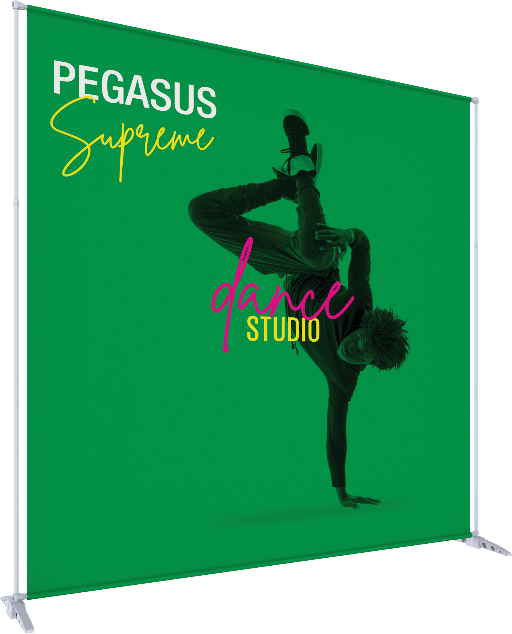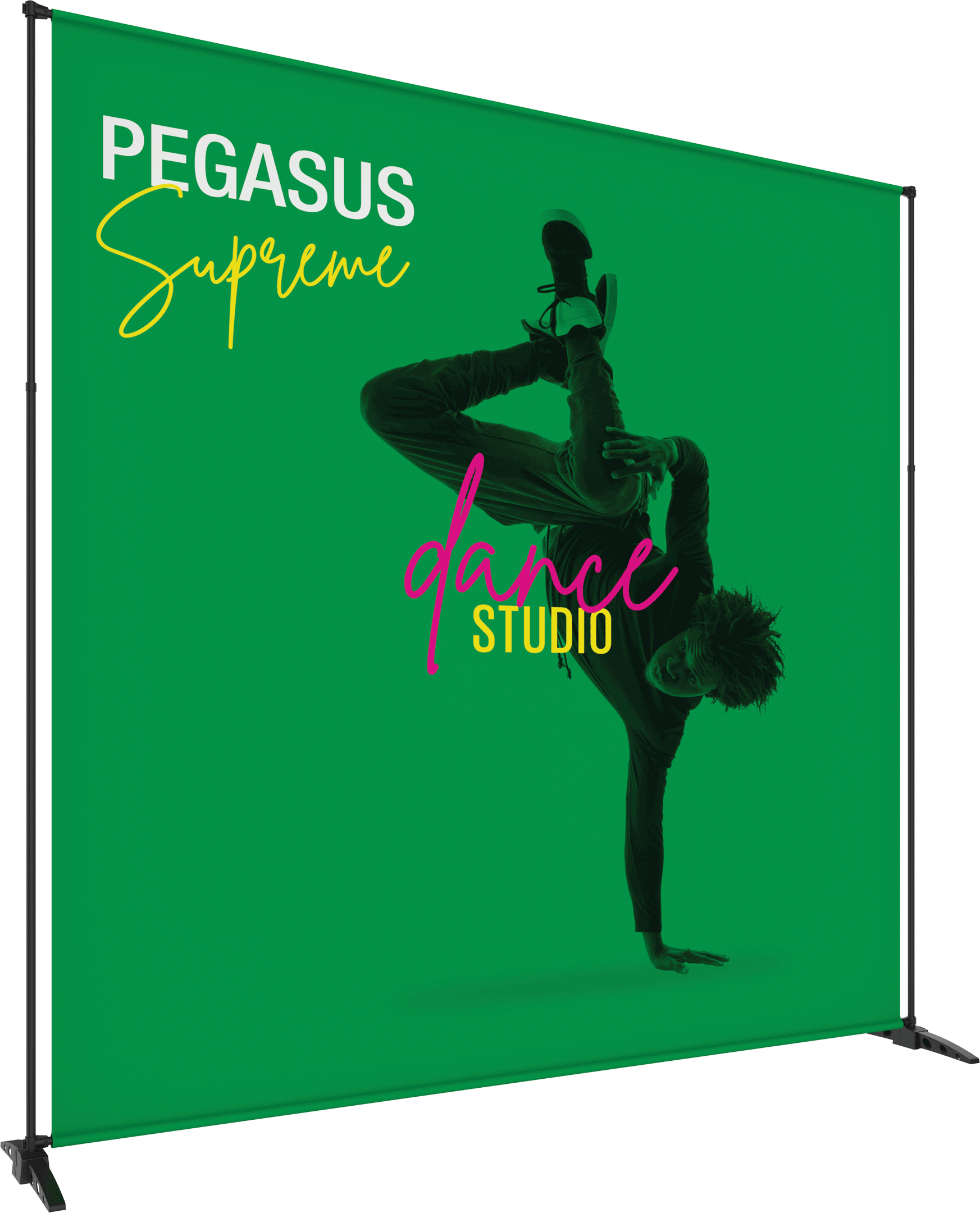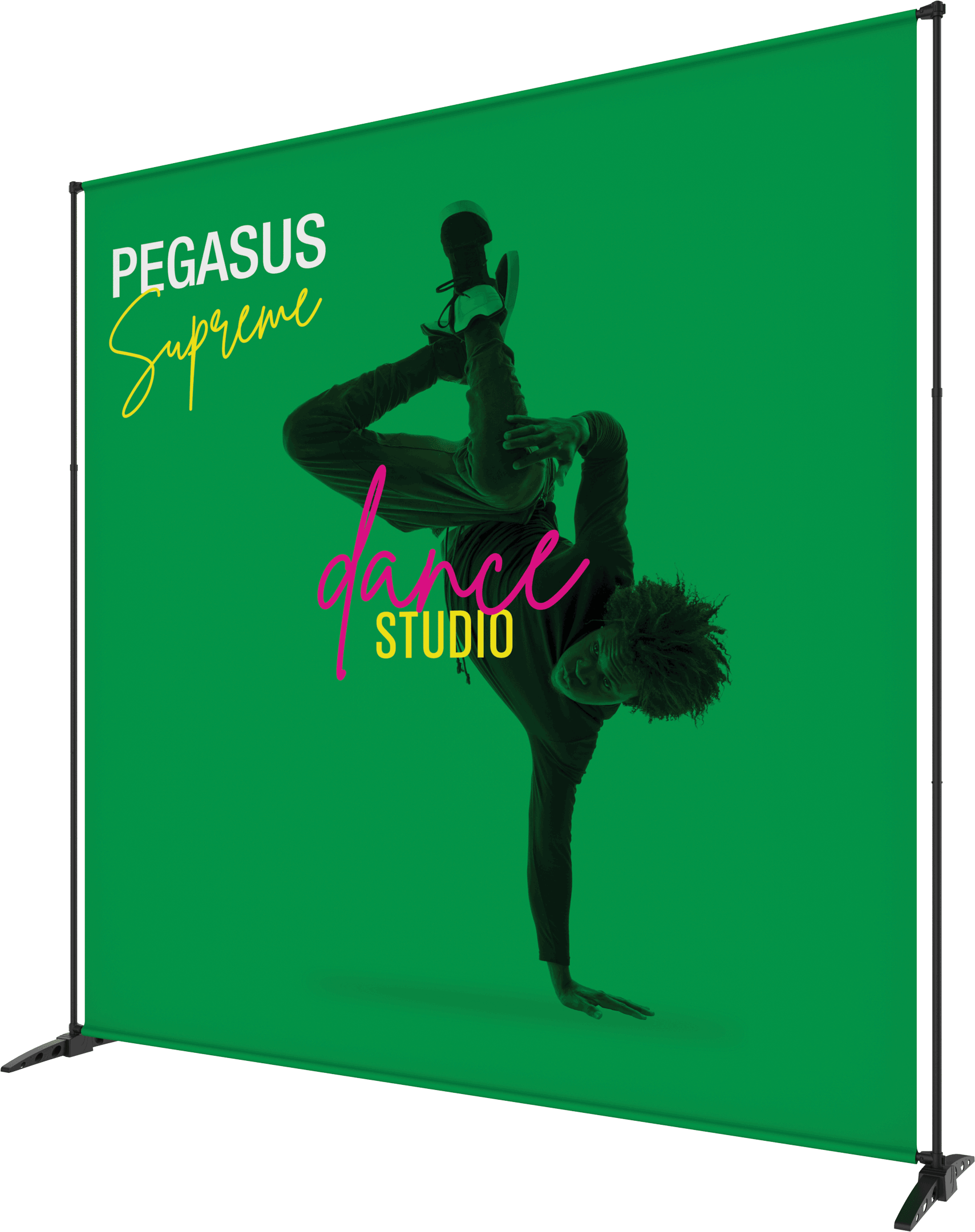 The Pegasus Supreme is a fully adjustable banner system. The Pegasus is easy to set up and is versatile due to a variety of height and width options and possibilities. Connect multiple units with new linking connectors (sold separately) for larger backwall configurations.