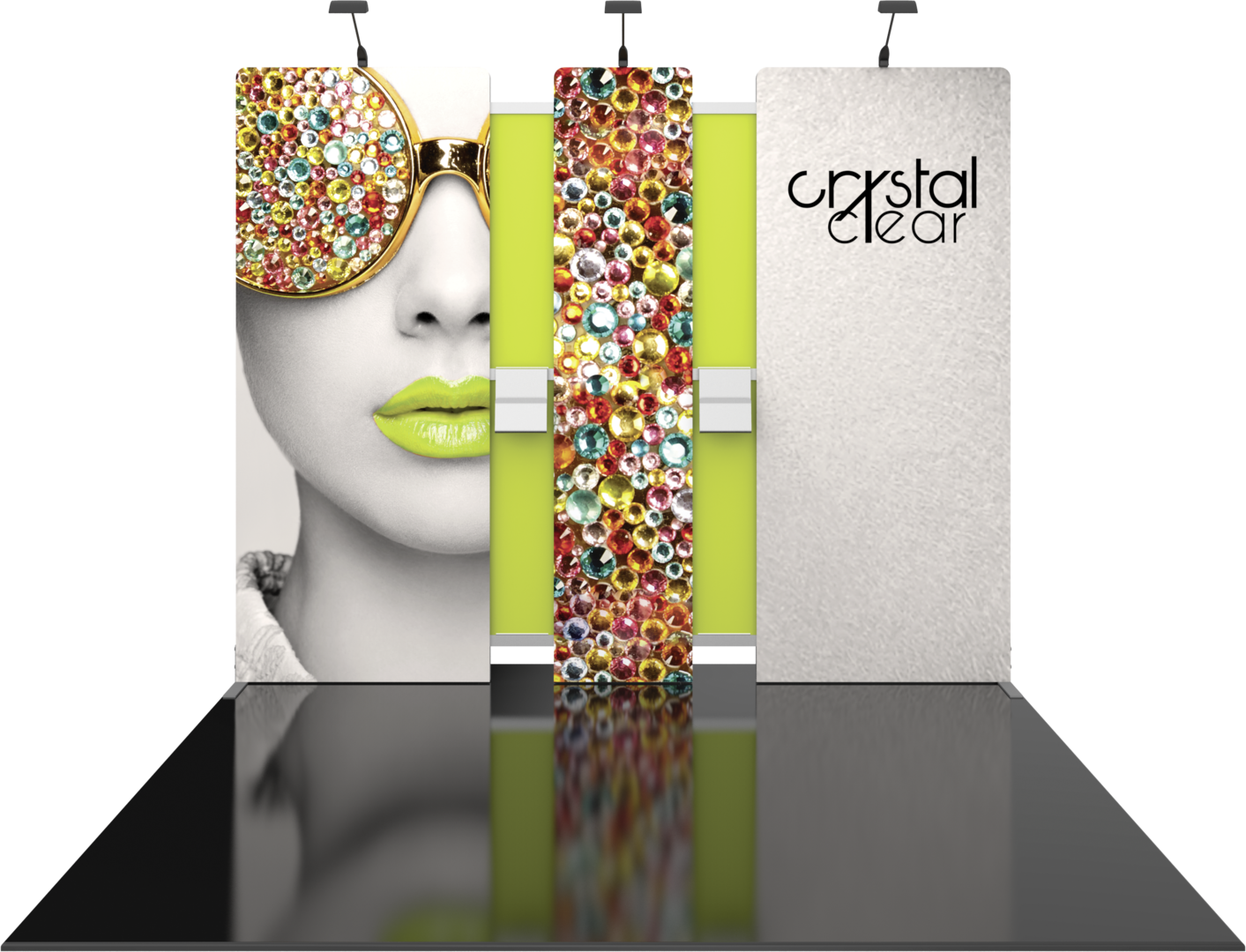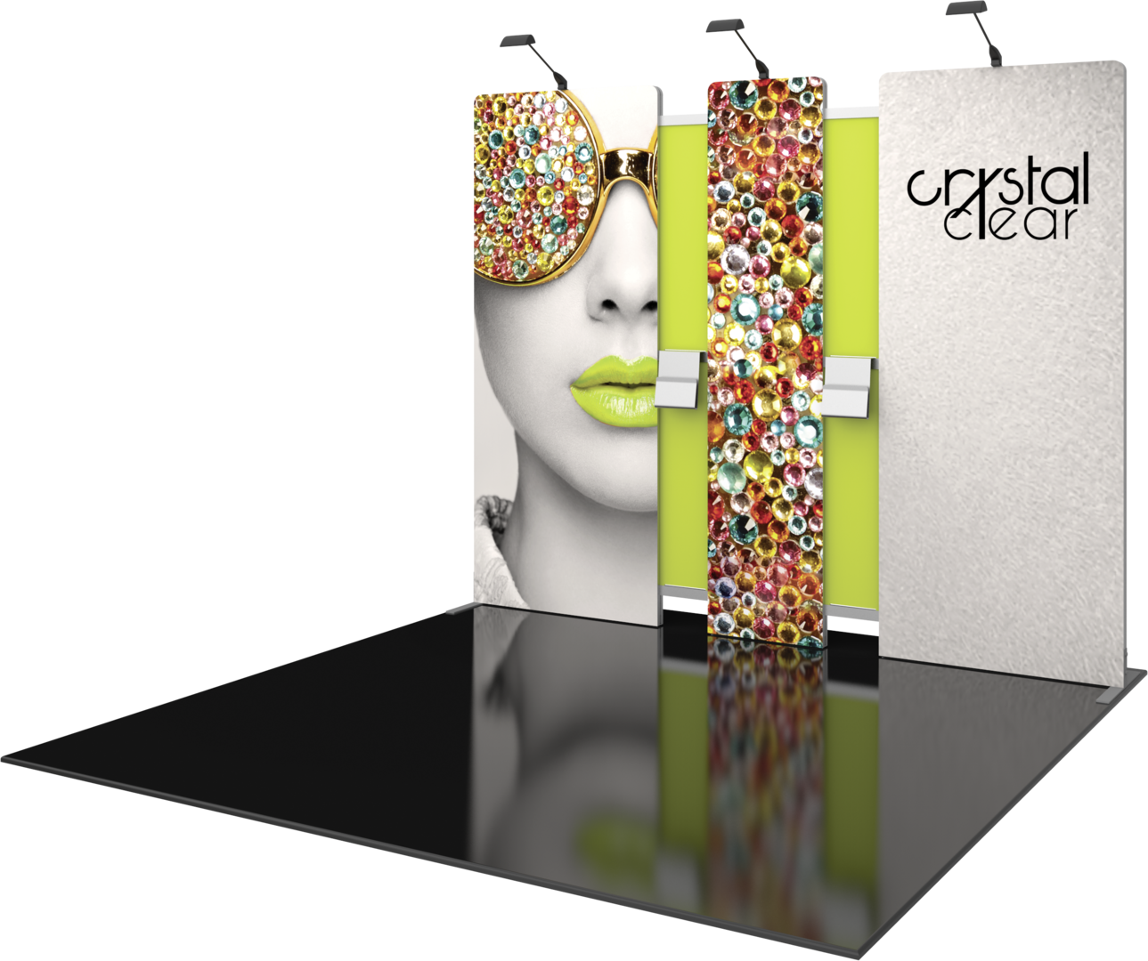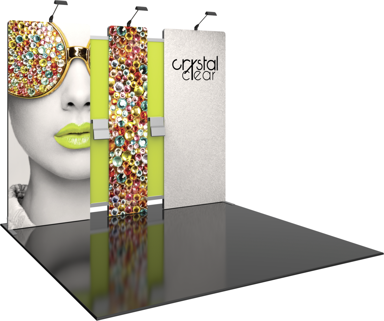 Vector Frame™ Master 10ft x 10ft inline Kit 13 is a portable modular display kit with a sleek, contemporary look. Kit 13 features push-fit fabric graphics, three easy-to-assemble extrusion frames that feature smooth, curved corners, and rigid graphic middle accents. Dual literature pockets attached to the back wall provide additional messaging opportunities. The kit includes LED display lighting to help your display stand out from the competition.