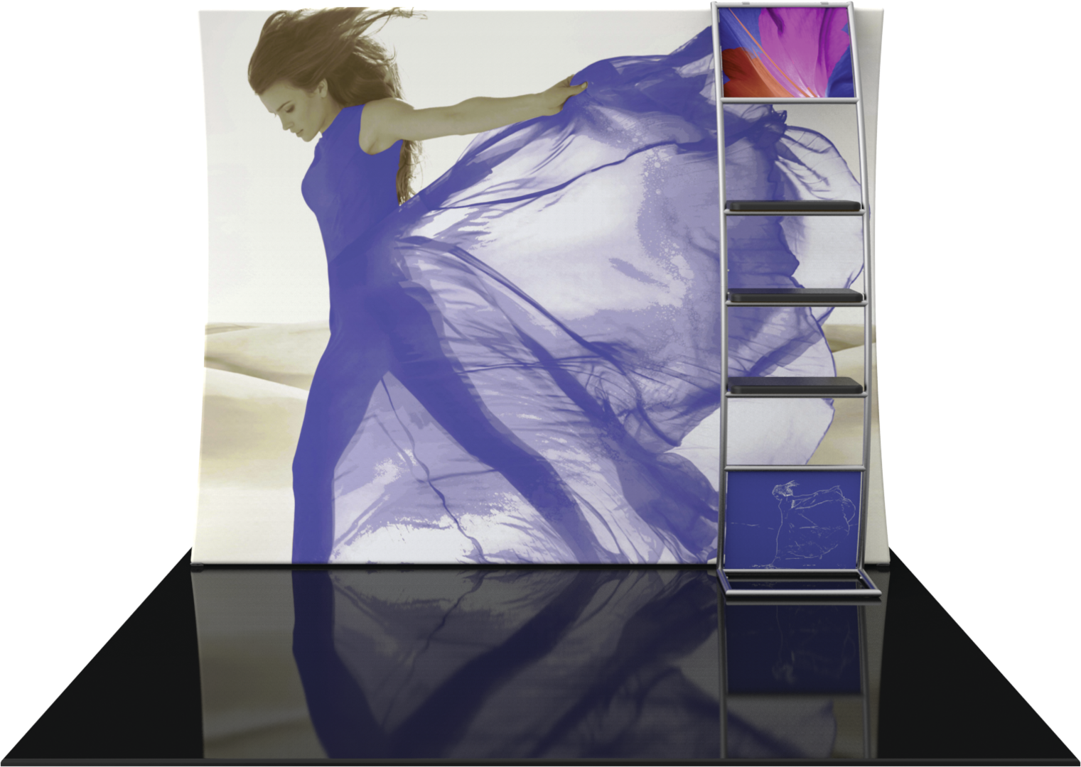 The Formulate VC10 Vertical Curve 10ft Fabric Display is designed to make an impact at events and trade shows, as well as a multitude of other environments. This exhibit kit features a stand-off accent ladder with three 23" shelves to display products with elegance. Durable stretch fabric pillowcase graphics pull over an aluminum tube frame and zip for a quick and easy set up.
