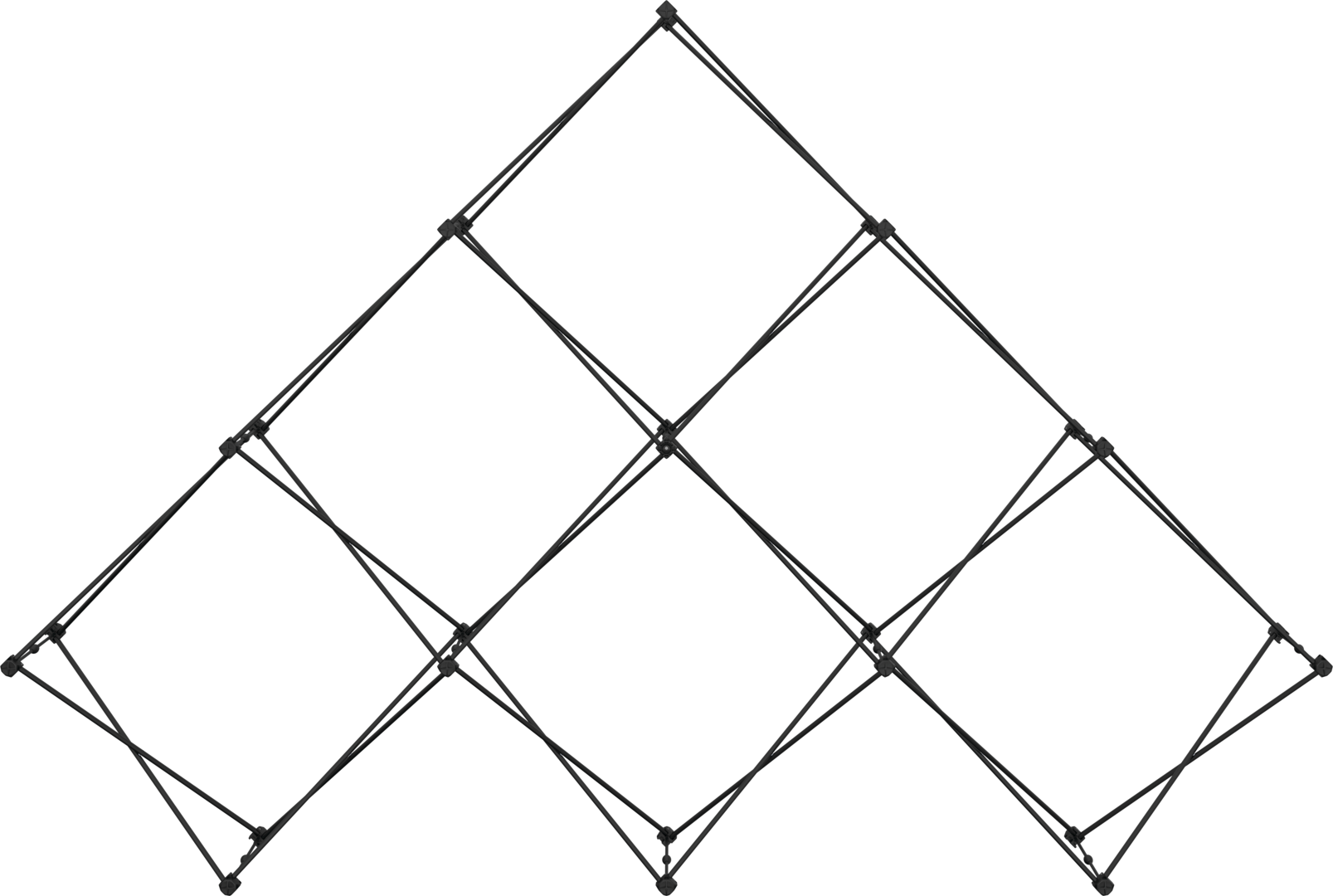 Xclaim 10ft wide 6 Quad Pyramid Kit 02 is a versatile stretch fabric popup display. Add dimension to your event or tradeshow with unique, exciting graphic styles. Xclaim 6 Quad Pyramid Kit 02 is easy to set up, lightweight and portable. The collapsible popup frame is fully magnetic (with magnetic linking connectors), making it simple to assemble and disassemble. Stretch fabric graphics come pre-attached to the frame, making assembly easy and fast. Graphics adhere to the hubs using push-fit attachment technology. Xclaim 6 Quad Pyramid Kit 02 comes with graphics, a frame, and a soft case with a shoulder strap.