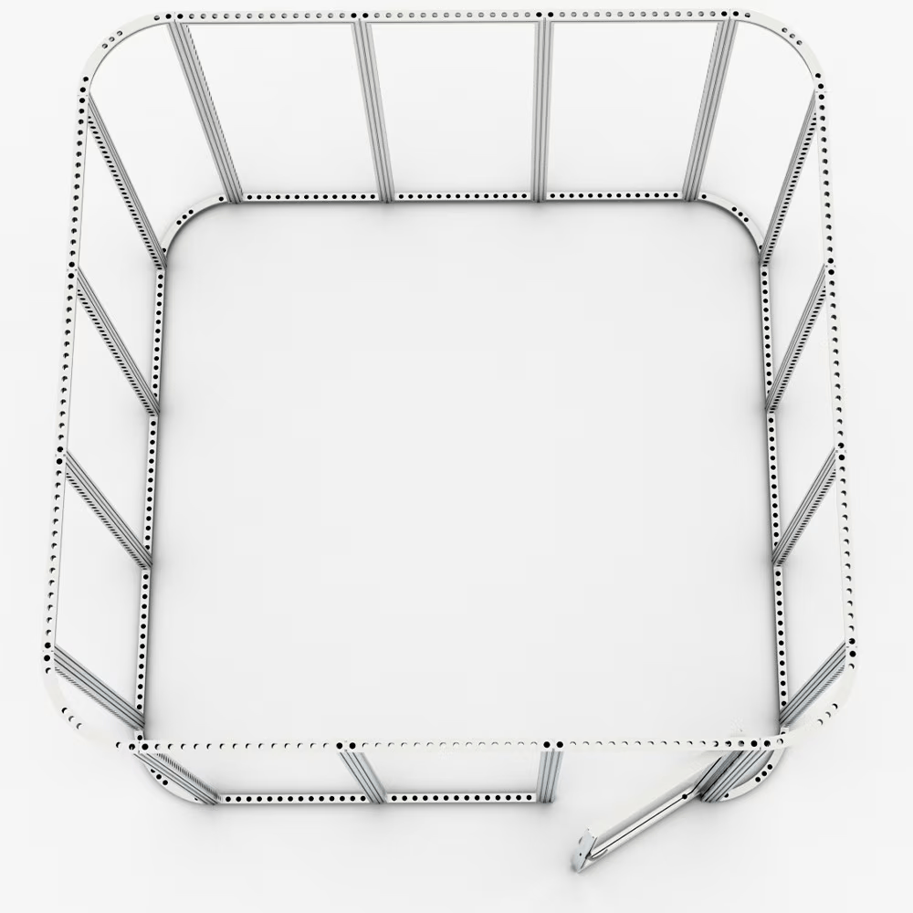 Modco Modular Display 6A is a three-dimensional 15' x 15' pre-designed exhibit room. Stylish and lively, this room is built using tool-free perforated modular aluminum frames and has rounded corners. Multiple size frames connect using tool-less pin connectors. The room features a door w/ lockset and key to complete your meeting room. Perforations are completely covered for a flawless finish.