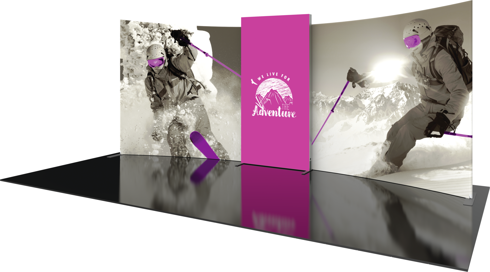 - Center wall features an extrusion frame, LED lights, and push-fit fabric graphics