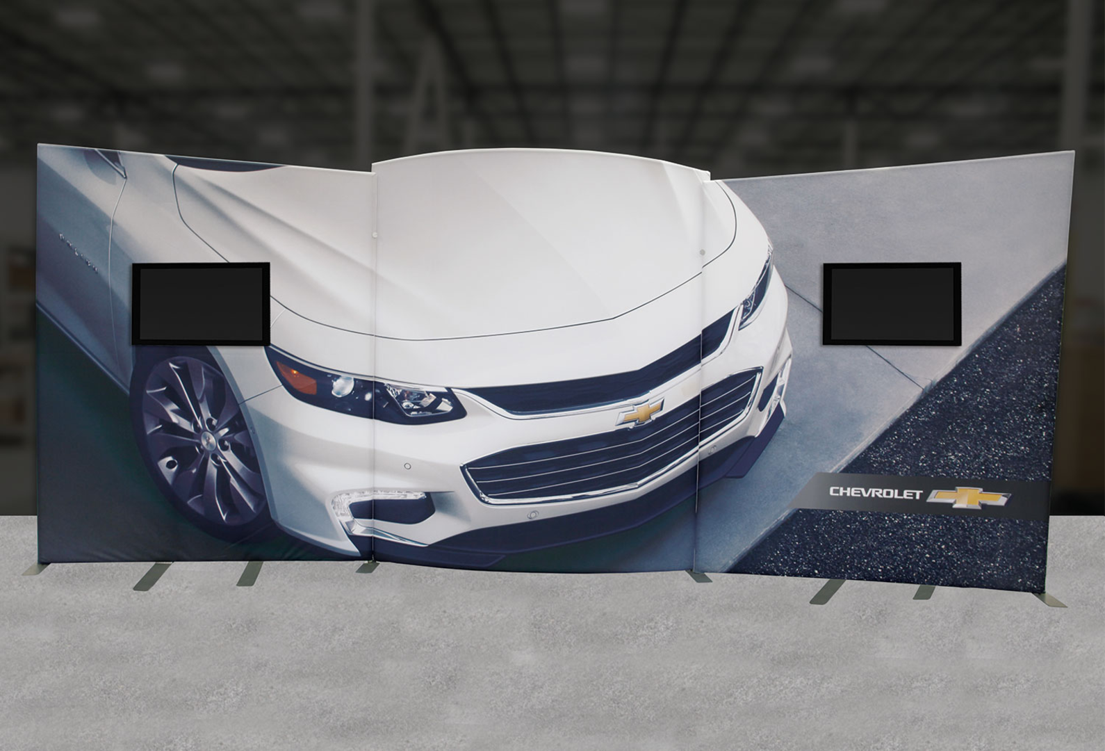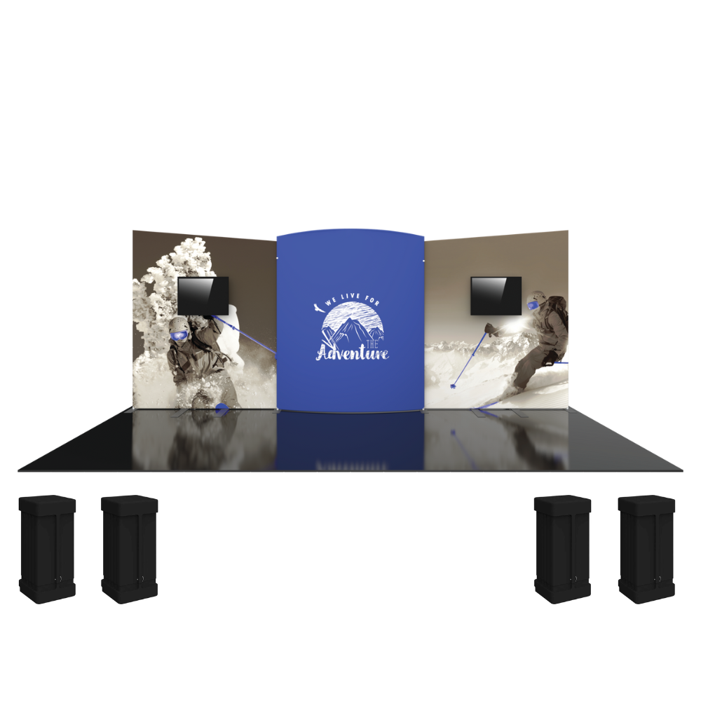 Formulate Designer Series 20ft Backwall Kit 08 display has unique stylistic features and is portable and easy to assemble. Kit 08 features three aluminum tube frames with snap-buttons/spigot connectors, two monitor kiosks supporting medium monitors, and three zipper pillowcase fabric graphics. Assembly is simple - connect the tube frames, place the monitor kiosks, pull the fabric graphics over the frames, and zip.