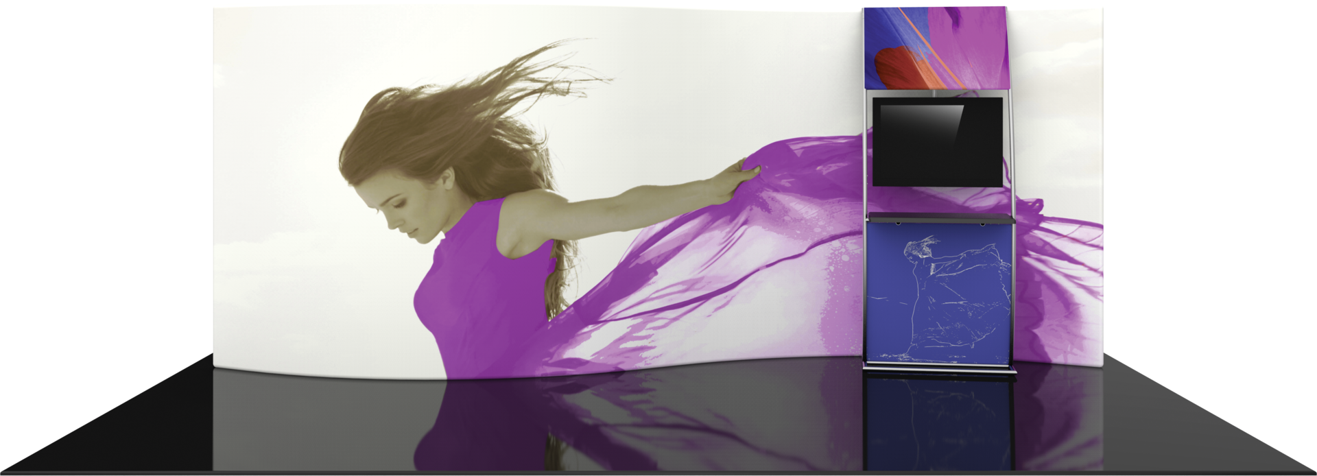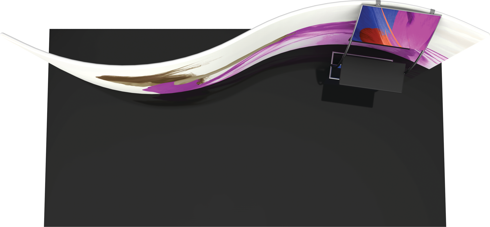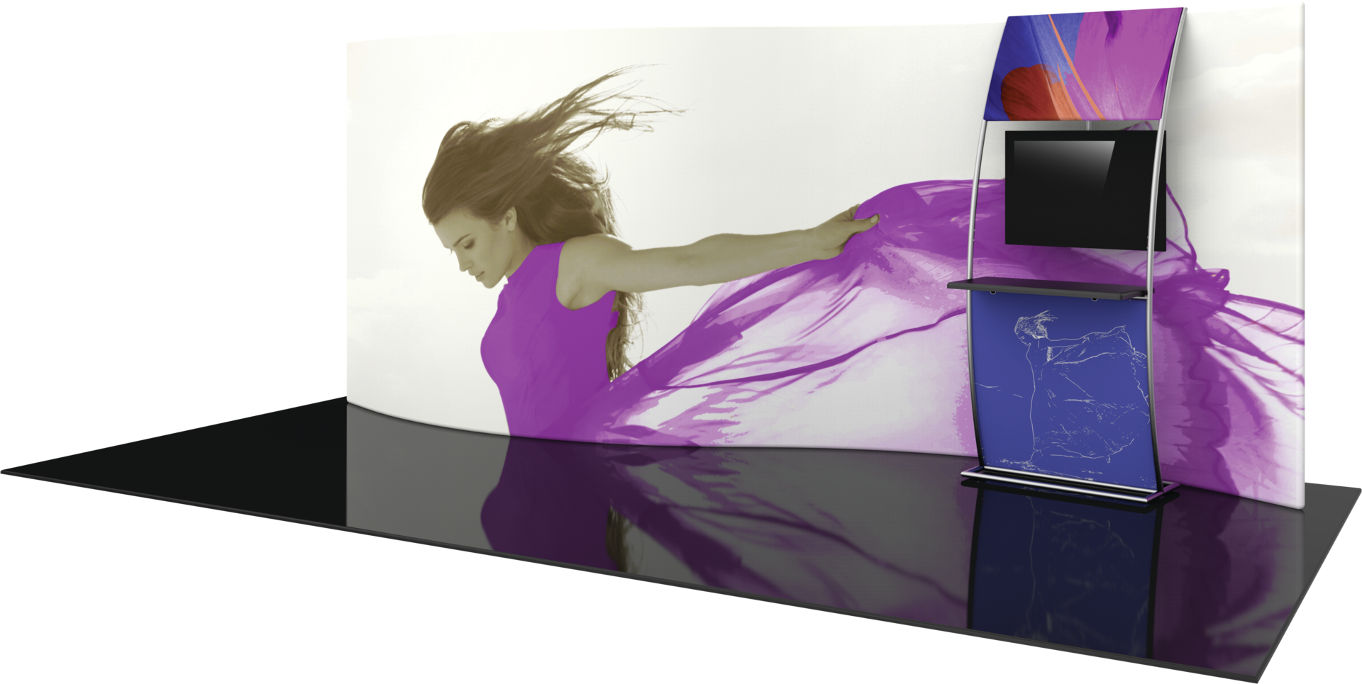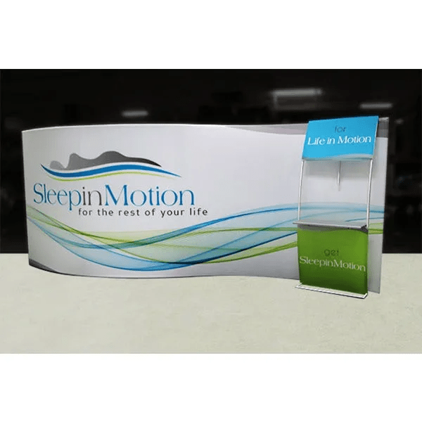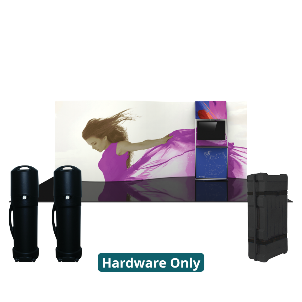 The Formulate 20 WSC2 Serpentine Curve display is a sophisticated, serpentine-shaped fabric exhibit that combines great style with functionality. The kit includes an accent ladder that can hold a medium monitor mount for multimedia displays, as well as a counter to hold a keyboard or small products for display. Stretch fabric graphics are hand-sewn, durable, and dry-cleanable.