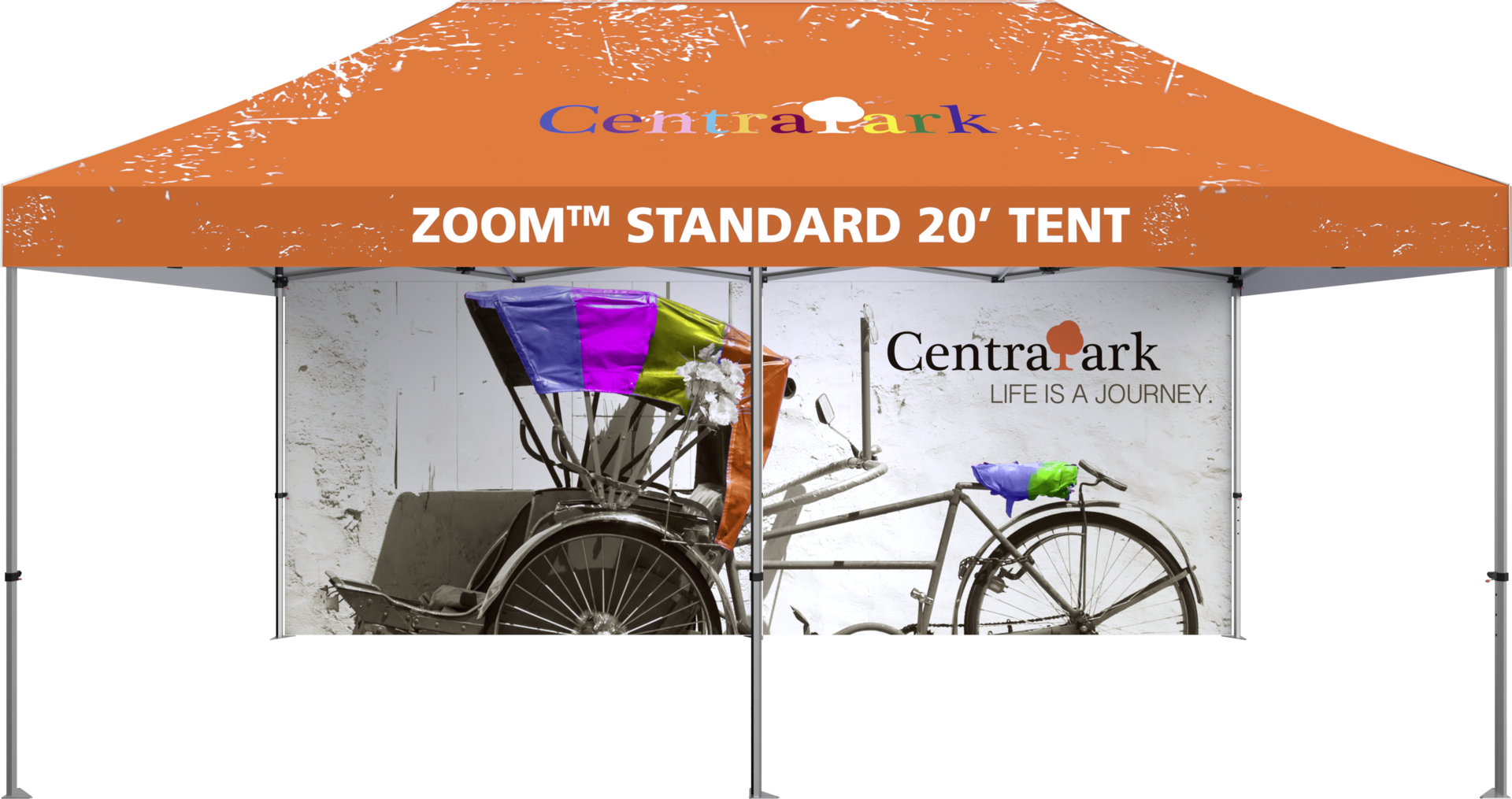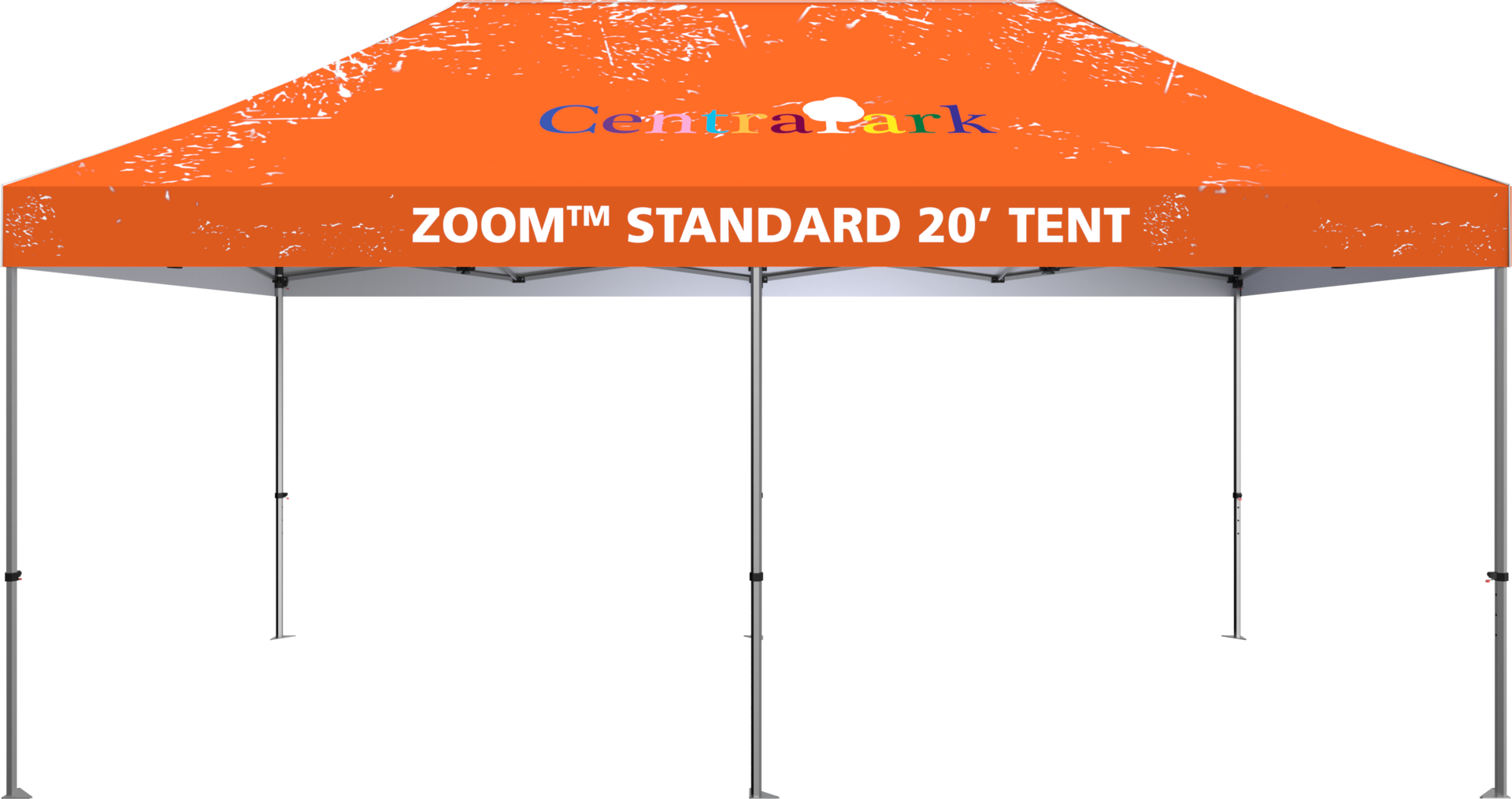 The Zoom™ Standard 20ft Popup tent is an ideal weather-resistant display for use at outdoor exhibitions, sporting events, concerts, and more. The rust-resistant aluminum frame is lightweight and stable, and vibrant stock and custom printed canopies are designed to withstand the elements.