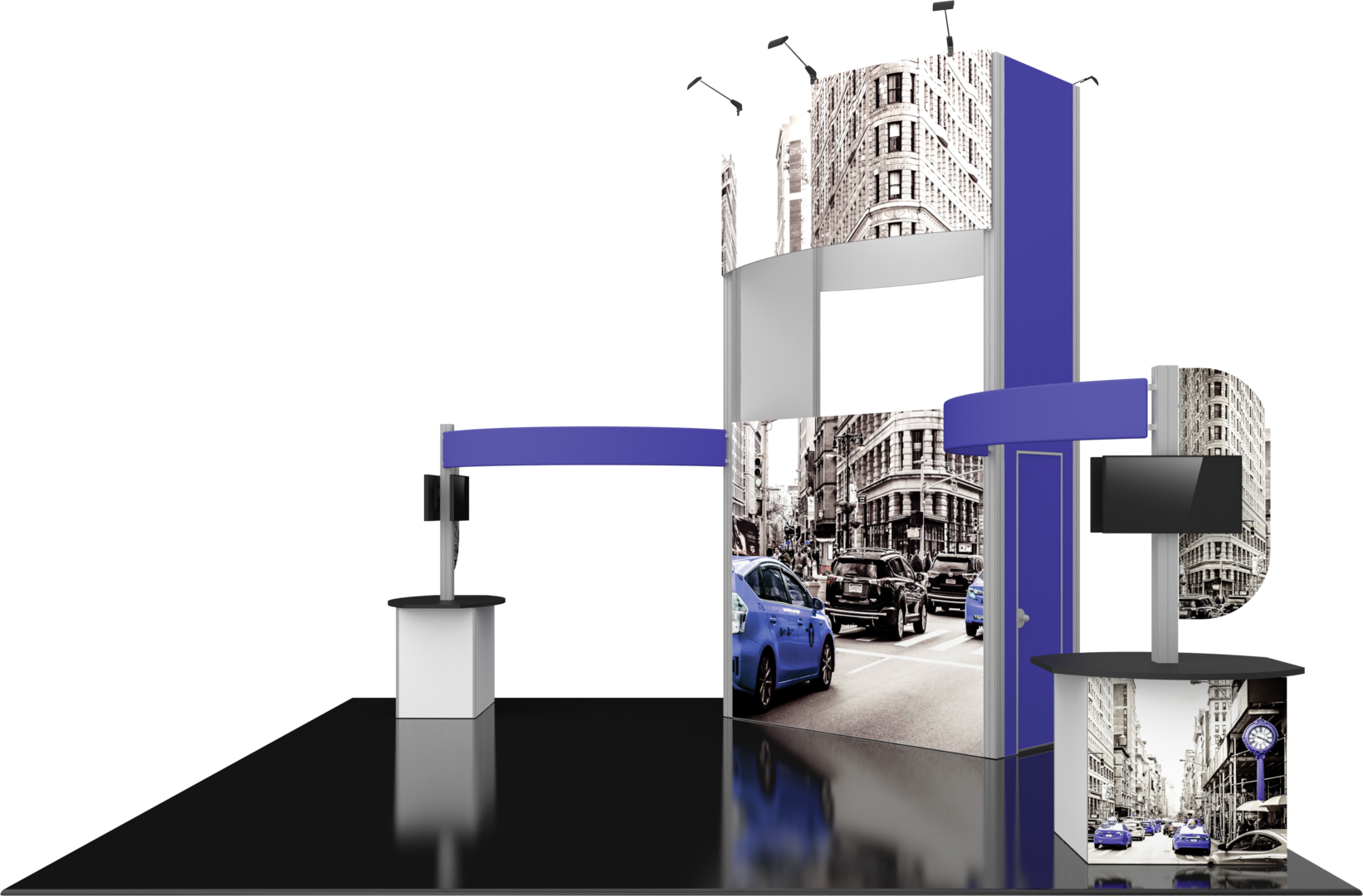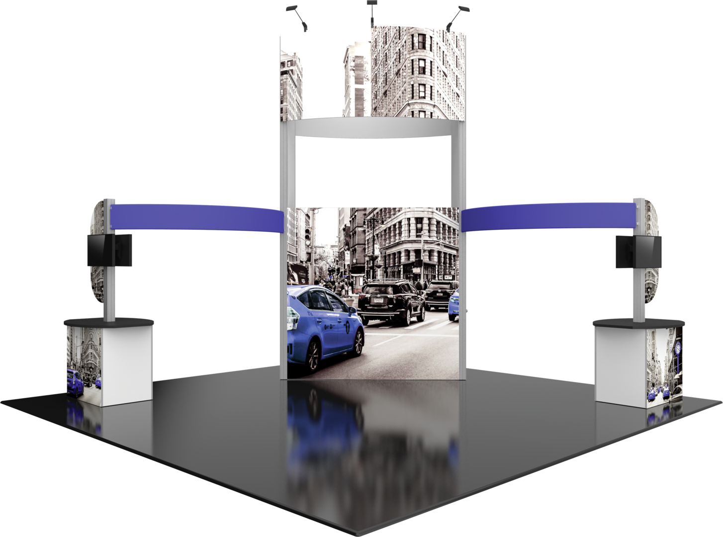 Hybrid Pro™ Modular Kit 17B is a striking 20ft x 20ft island exhibit that allows your brand to be seen up high without a rigging requirement. Kit 17B features a heavy-duty aluminum extrusion frame coupled with seamless push-fit SEG fabric graphics. A 15' 9" central tower structure broadcasts your brand across the show floor, and two curved side arms provide additional room for displaying messaging. Two connected kiosks combining dual monitor mounts, rigid display panels, and counters with locking storage provide additional room for messaging, functionality, and storage. LED display lighting atop the central tower illuminates messaging for a clear display.