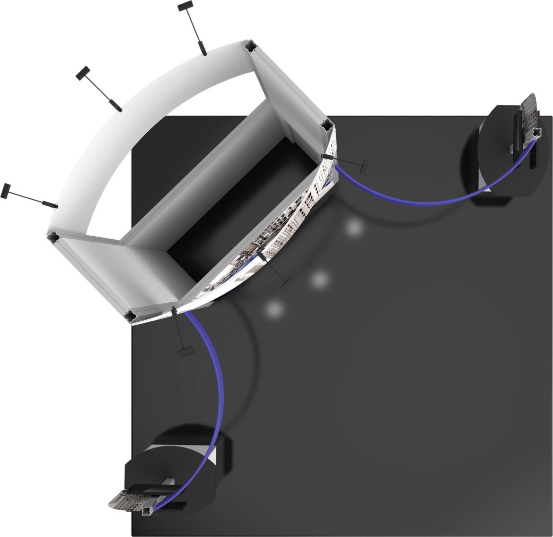 - Kit includes frame, accessible lockable storage space, two pillowcase graphics for the top of structure, four push-fit fabric graphic panels, two shaped Sintra panels, two kiosks, four small monitor mounts*, six Lumina 200 LED floodlights