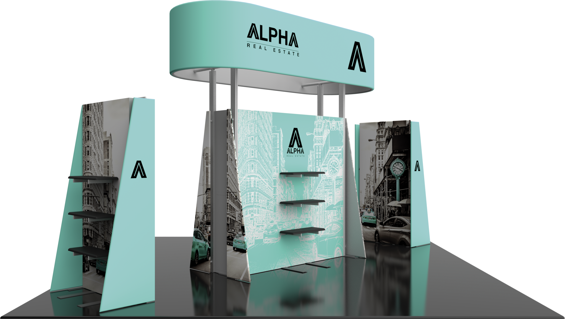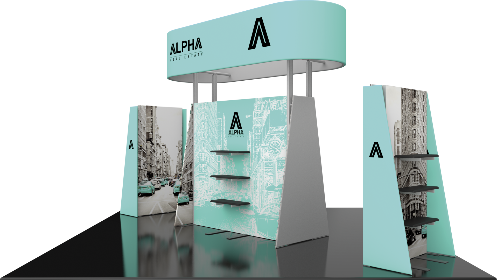 - Each kiosk includes four walls, two pillowcase fabric graphics and two push-fit fabric graphics, and three shelves for product display