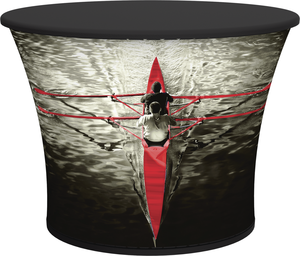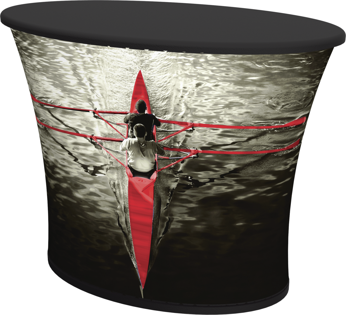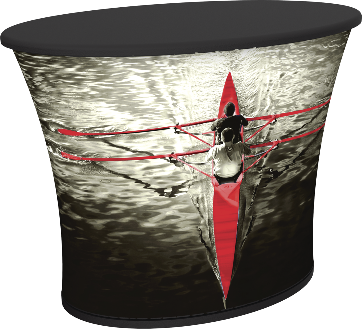 Formulate Oval counter couples lightweight hardware with a printed stretch silicone edge fabric graphic (SEG) to create a funky and functional reception stand with an oval shaped tabletop. The graphic is enclosed on all sides from top to bottom, creating a private storage space. Easily add a reception space, extra display capability, or storage to any trade show exhibit or event and retail environment. Tabletop and base are available in choice of four finishes.
