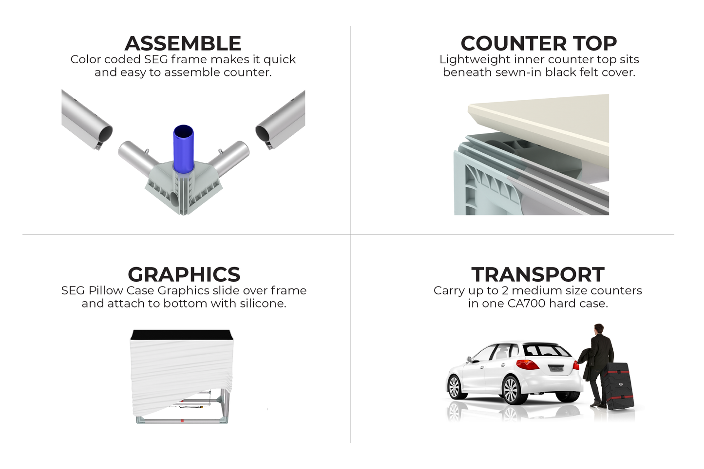 Breathe new light into your brand, exhibit, event or retail shop with the WaveLight ® Casonara SEG Light Counters. This pioneering new SEG tension fabric light box is designed to make backlit graphics more portable, modular and customizable. Our 360 º illumination technology provides more visibility for your brand and more places to present your ideas. We have also color coded the frames which provides our users the ability to quickly assemble and disassemble the display without tools €“ or breaking a sweat.
