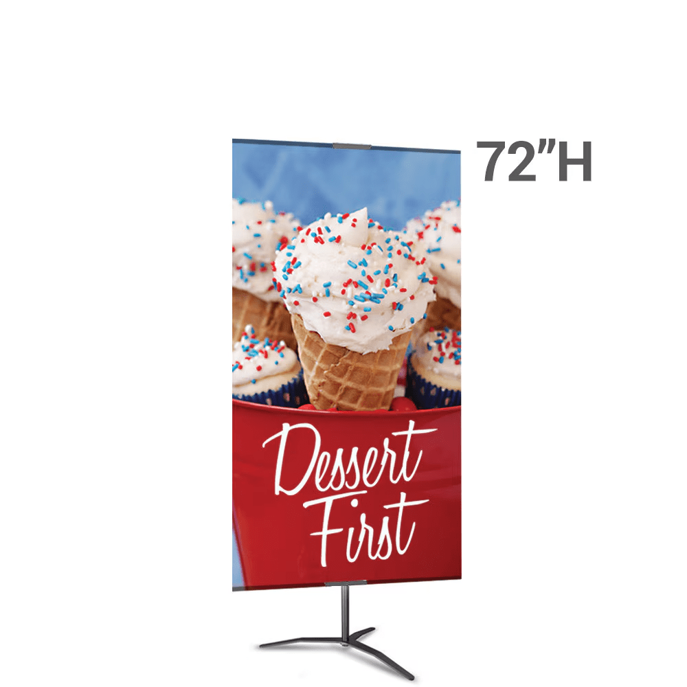 The Classic Banner Stand features easy-to-use aluminum clutch locks, a heavy-duty base, and sleek styling. It is perfect for 1-sided or 2-sided use. Height adjusts from 24" to 96". It accepts Hemmed Banners up to 24" Wide. Must be Hemmed to accept 1/2" dowels (provided). It also accepts Foam Core.