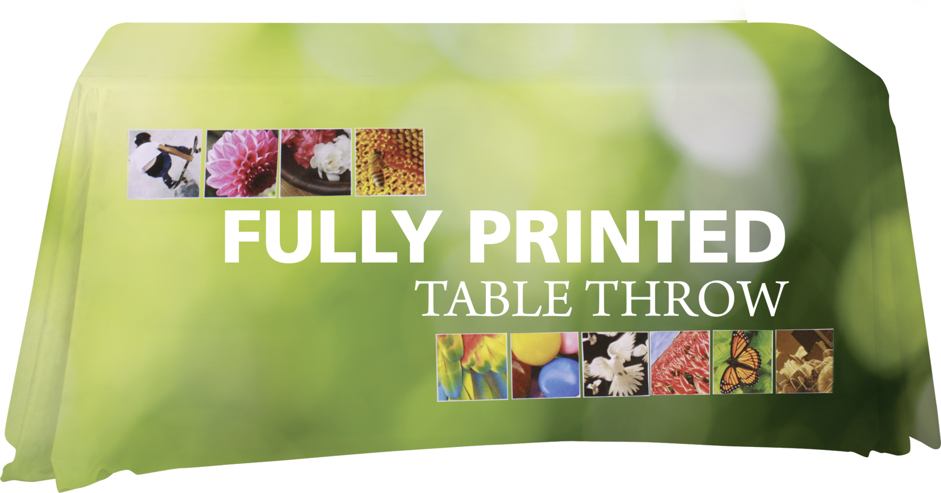Premium dye-sublimated, fully printed table throws are the perfect complementary display accessory. Printed table throws allow for full-color messaging and branding opportunities without requiring additional display space. A must for smaller booth spaces, and perfect for traveling portable displays and sales presentations. Printed table throws are available in 8ft, 6ft, 4ft, and tall 4ft (48"W x 36"H demo table) sizes, and have full size and economy (3-sided) options available.