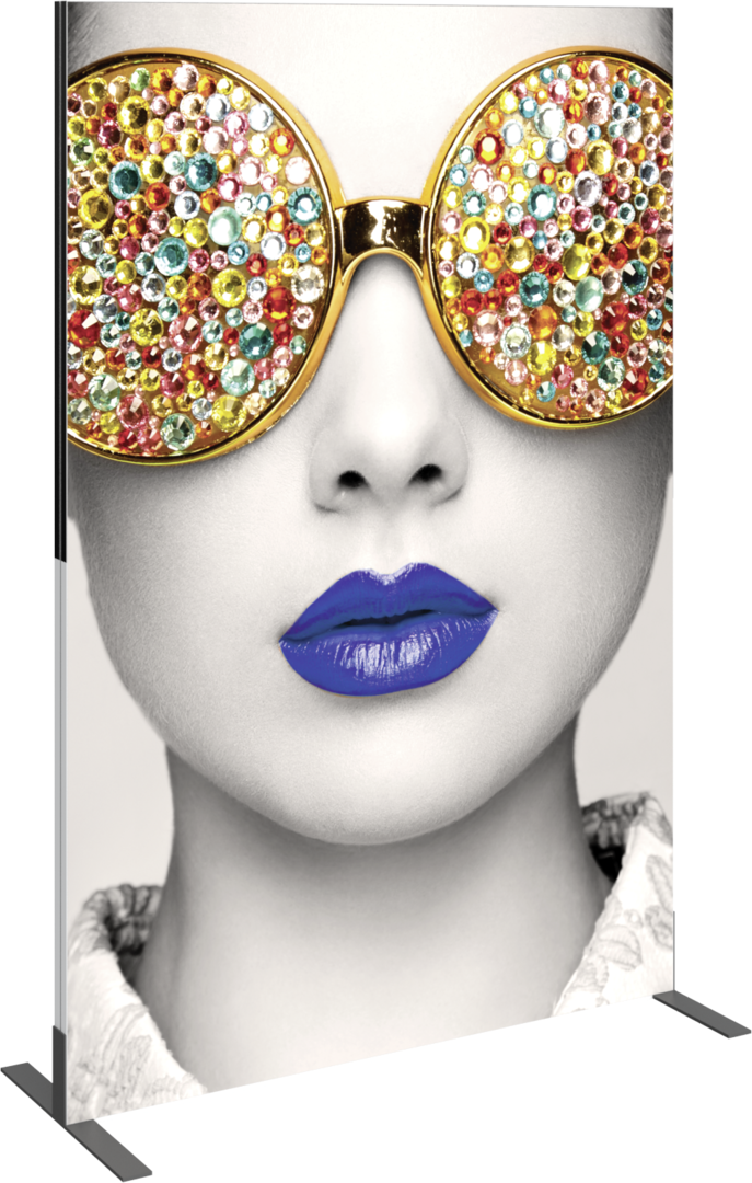 Vector Frame™ fabric banner R03 is a modern, extrusion-based fabric graphic banner display measuring 48.11"W x 71.12"H. The 2" aluminum extrusion frames are easy to assemble and disassemble and come with the choice of single-sided or double-sided push-fit SEG fabric graphic murals. Vector Frame banner R03 can be used to display messaging or art in a retail, corporate, event, or tradeshow environment and more.
