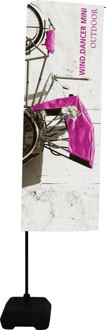The Wind Dancer Mini Flag is a great option for outdoor and indoor banner displays. It offers an adjustable display height and comes with a black hollow base, which can be filled with water or sand for increased stability. The display flag adjusts in height up to 8'3" and comes with single and double-sided display options.
