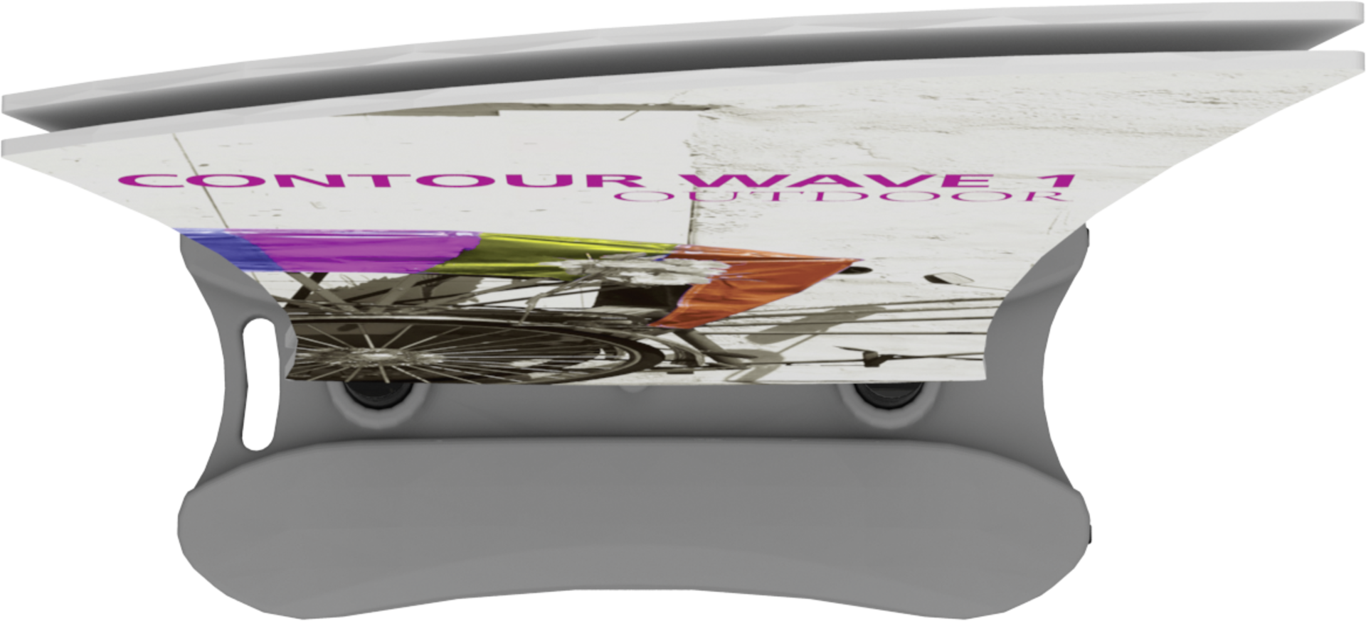 The Contour Wave 1 with water base is a heavy-duty double-sided sign with sweeping lines that utilizes hook and loop connections to make graphic changes a breeze. The compact, molded water base features integrated wheels and a handle for easy transportation and can be filled with either water or sand for added stability.