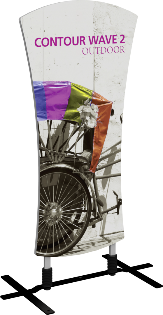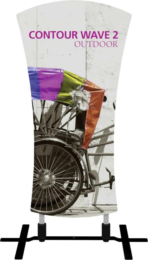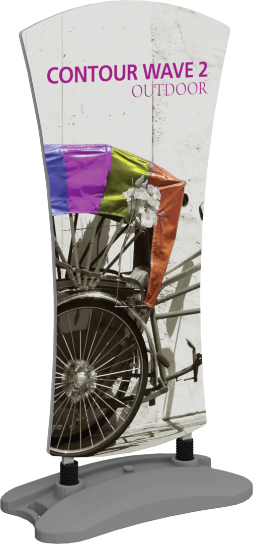 The Contour Wave 2 with water base is a heavy-duty double-sided sign with an hourglass shape that utilizes hook and loop connections to make graphic changes a breeze. The compact, molded water base features integrated wheels and a handle for easy transportation and can be filled with either water or sand for added stability.