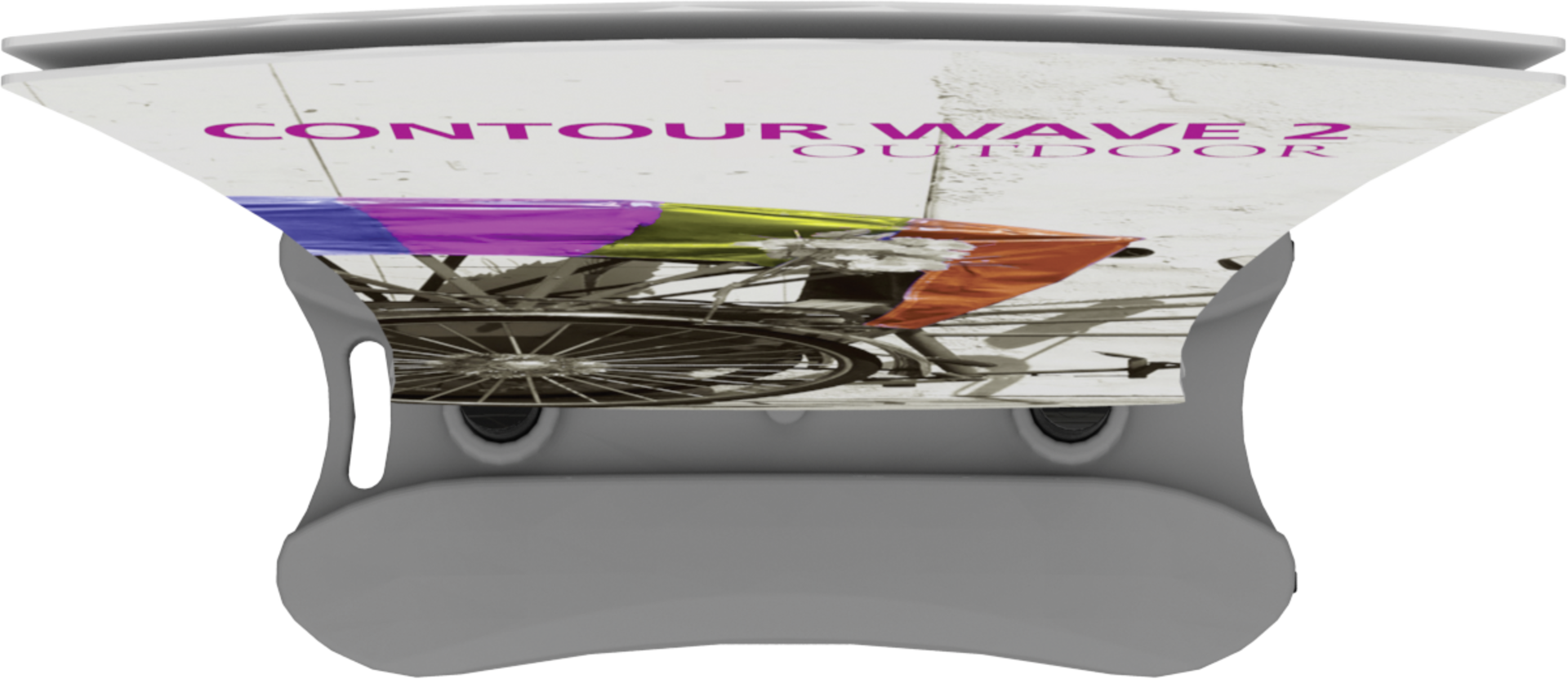The Contour Wave 2 with water base is a heavy-duty double-sided sign with an hourglass shape that utilizes hook and loop connections to make graphic changes a breeze. The compact, molded water base features integrated wheels and a handle for easy transportation and can be filled with either water or sand for added stability.
