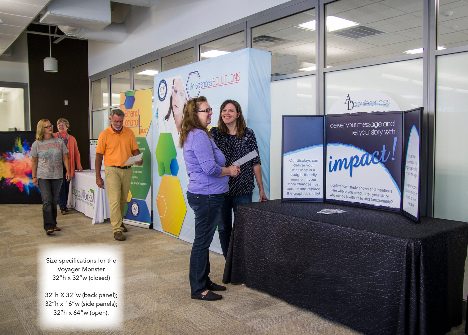 The Voyager™ Monster has been specially developed as a briefcase style, tabletop display, and is a great choice for promotions on the go. It measures 64in wide and 32in high when open, and has a rigid, thermos-formed ABS exterior and a black, Hook, and loop compatible fabric interior. Optional detachable 22mil PVC graphics and header panels available. Extra graphics can be stored in the display and packed away for easy storage. Voyager Monster has a lifetime hardware warranty against manufacturer defects.