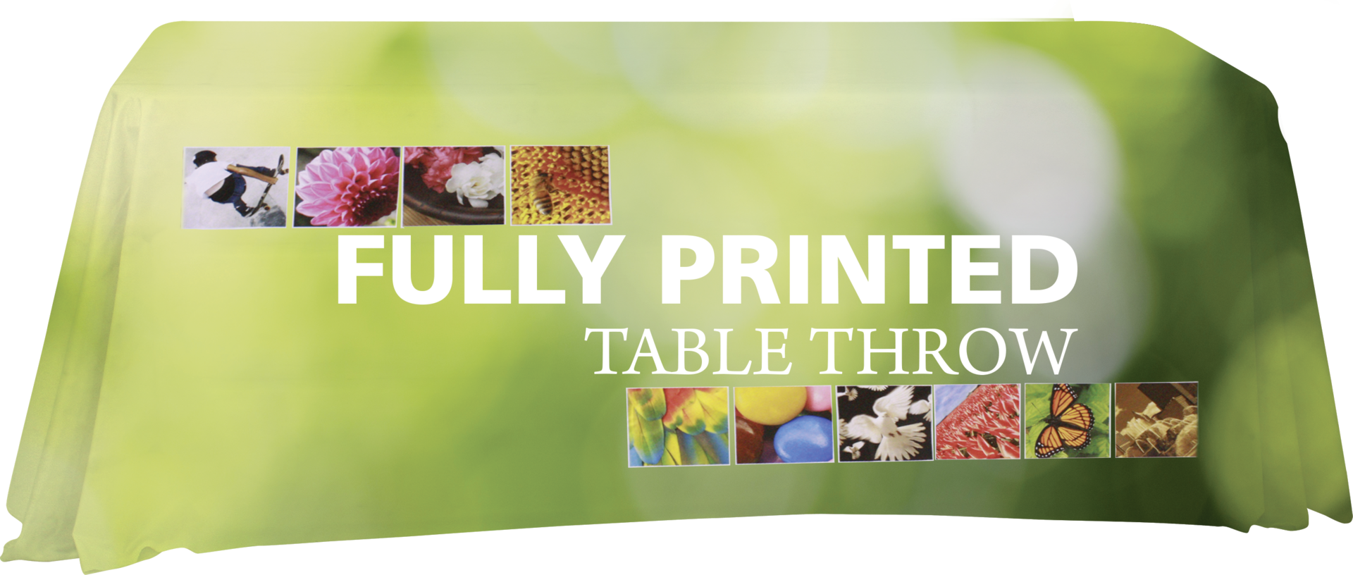 Premium dye-sublimated, fully printed table throws are the perfect complementary display accessory. Printed table throws allow for full-color messaging and branding opportunities without requiring additional display space. A must for smaller booth spaces, and perfect for traveling portable displays and sales presentations. Printed table throws are available in 8ft, 6ft, 4ft, and tall 4ft (48"W x 36"H demo table) sizes, and have full size and economy (3-sided) options available.