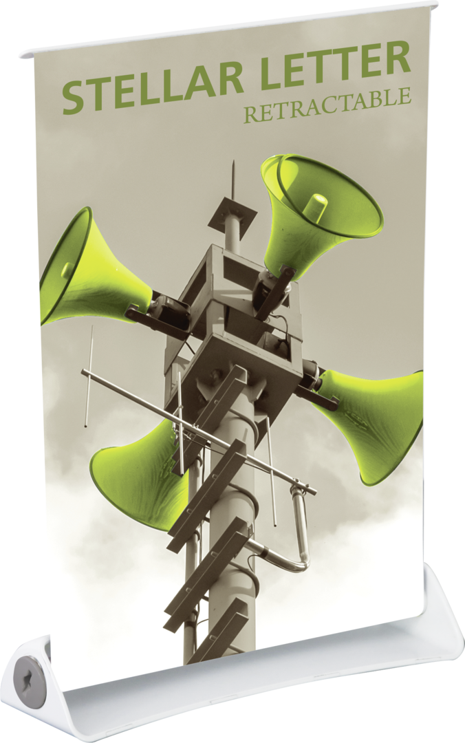 The Stellar Letter tabletop retractable banner stand features a lightweight, injection-molded white plastic base and is ideal for adding messaging to tabletop displays without sacrificing valuable space. The compact 9.13"W x 11.75"H design provides a big impact with unique styling.