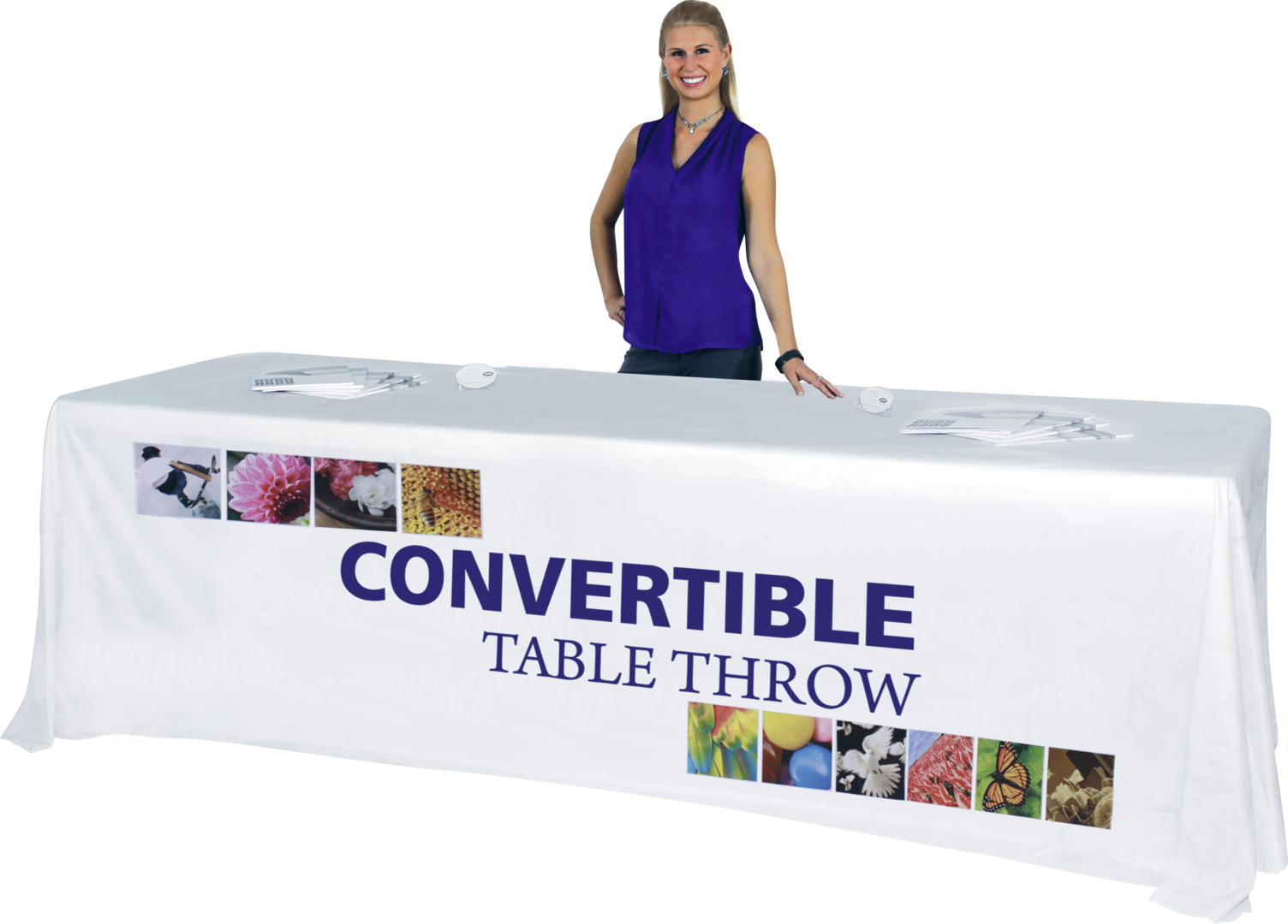 Our premium fully-printed convertible table throw allows you to quickly switch between an 8ft table cover and a 6ft table cover within minutes. Convertible table throws are printed using full-coverage dye-sublimation, with custom full-color graphics printed in the USA on washable polyester. Add a customized, professional branded look at any sales event, trade show, or retail environment!