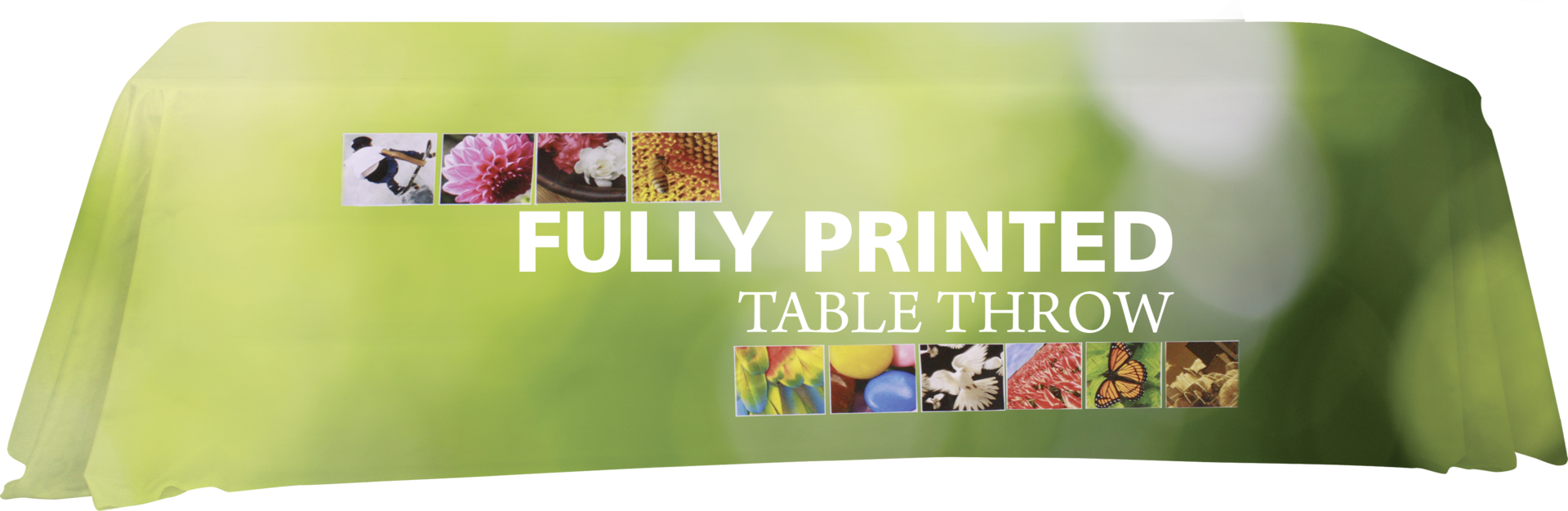 Premium dye-sublimated, fully printed table throws are the perfect complementary display accessory. Printed table throws allow for full-color messaging and branding opportunities without requiring additional display space. A must for smaller booth spaces, and perfect for traveling portable displays and sales presentations. Printed table throws are available in 8ft, 6ft, 4ft, and tall 4ft (48"W x 36"H demo table) sizes, and have full size and economy (3-sided) options available.