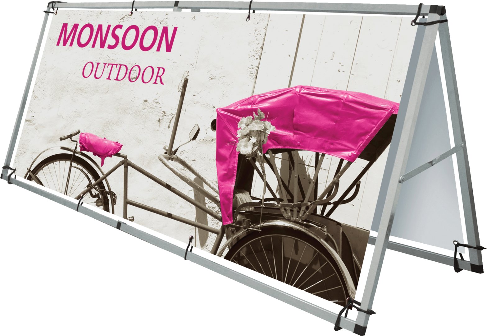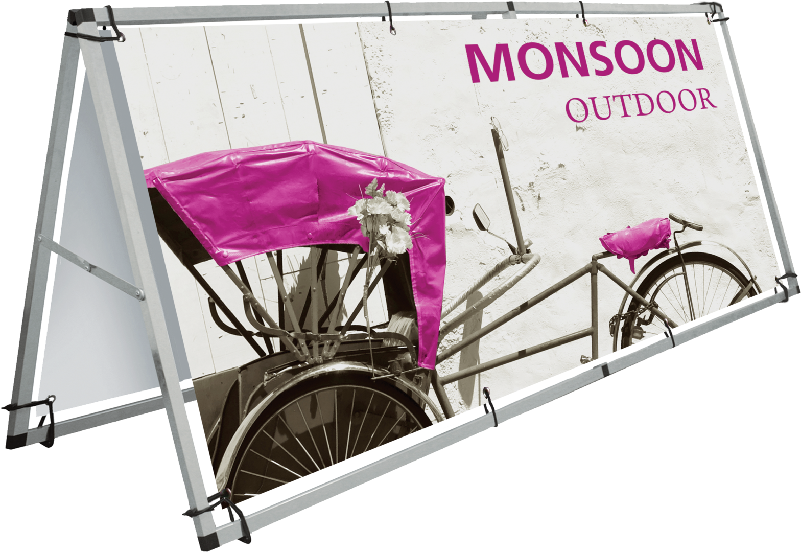 Monsoon Outdoor Sign Stand is a large format banner A-frame made from lightweight aluminum, ideal for use with eyelet banners. Monsoon is very easy to use, reusable, and is the perfect graphics carrier for venues, events, exhibitions, promotions, and indoor or outdoor shows.
