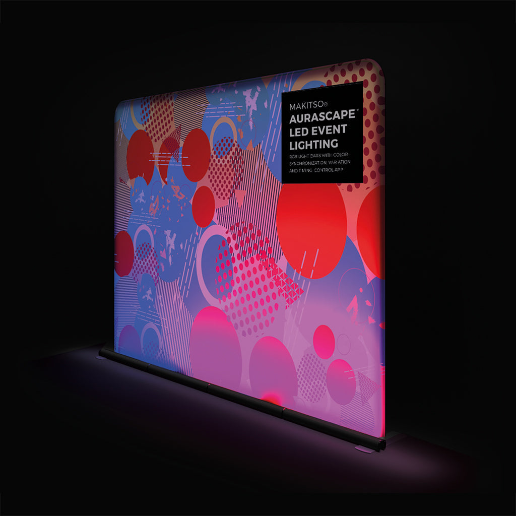 The Makitso AuraScape LED RGB Light Bars used with fabric displays can create a magnetic effect that draws people in. Place the light in a slow rotational color mode and the display becomes kinetic and dynamic. Or change the mood, tone or atmosphere of your environment throughout the day with an app-controlled from your phone. This will allow current and new users of tension fabric display systems to broaden the application of their displays.