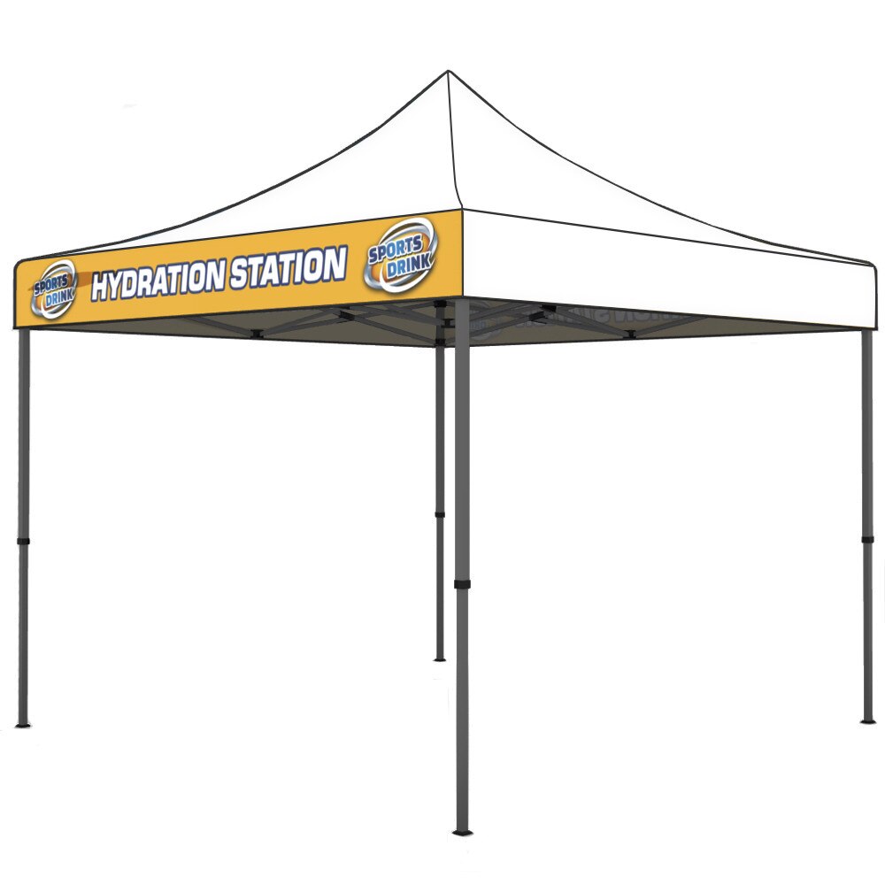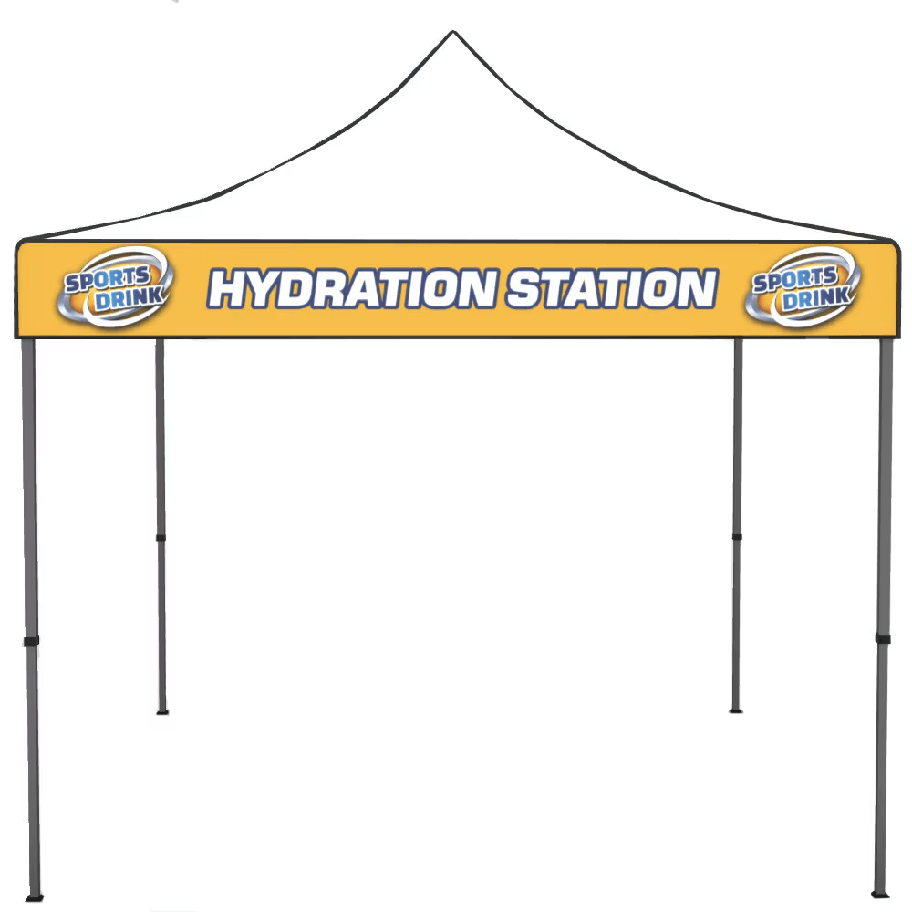 Our Casita Canopy Tents™ are an excellent way to provide shade during outdoor and indoor events. These canopies are standard 10’ x 10’ size and are available in custom dye-sub print which has a high-quality finish with vivid color. Set up is quick, easy, and user-friendly. Telescopic legs snap into place offering a range of heights. This kit includes a convenient travel bag with wheels to store your tent frame and graphics in between events. The Valance Only option features dye sub-printed valence graphics with blank white canopy top peaks. You have the option of custom prints on all 4 valances or 2 valances on opposite sides. Like all other Casita Canopies, you have the option of white or black seam trim to better match your graphics.