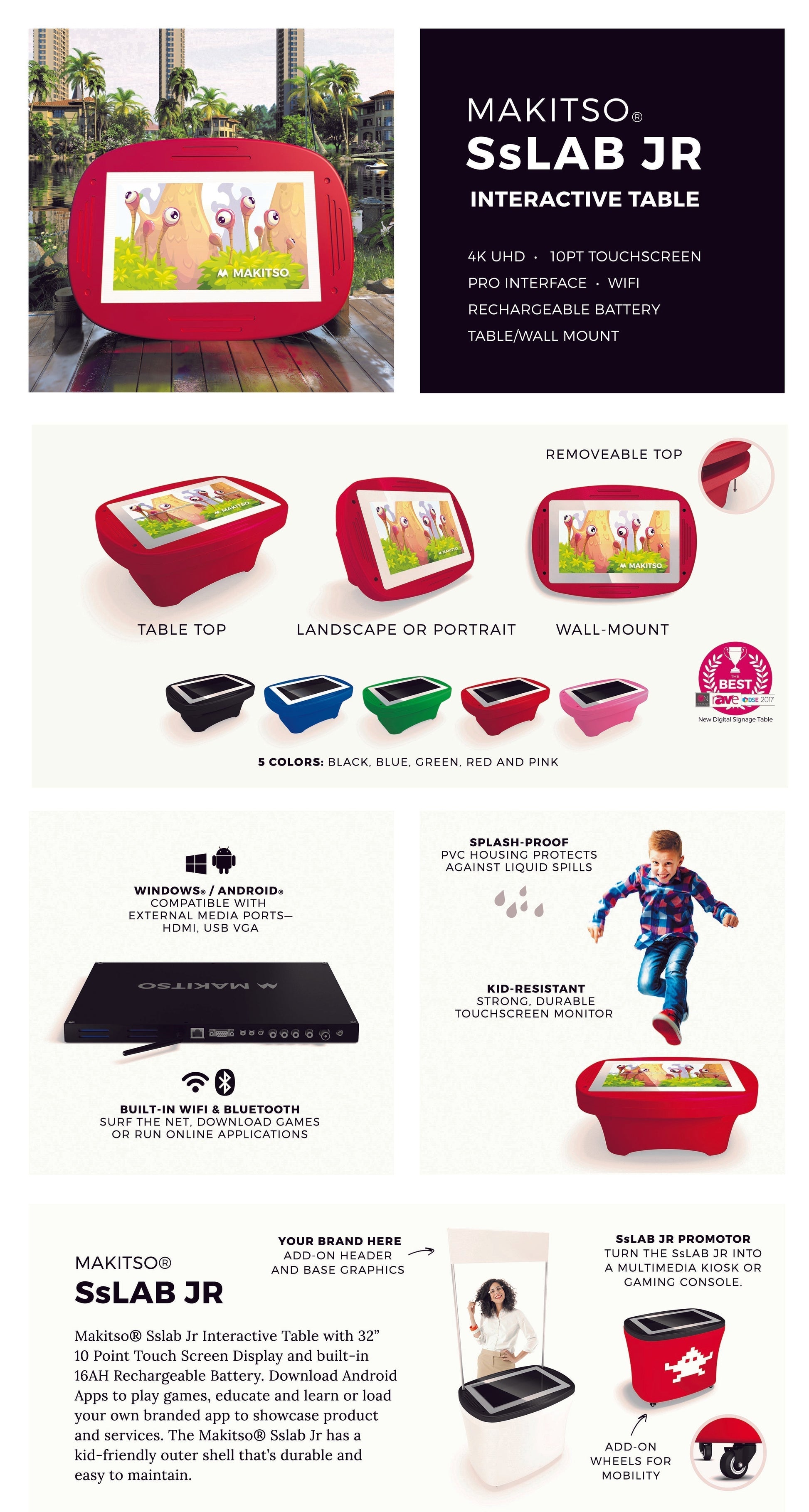 Makitso ® Sslab Jr Interactive Table with 32 €� 10 Point Touch Screen Display and built-in 16AH Rechargeable Battery. Download Android Apps to play games, educate and learn or load your own branded app to showcase products and services. The Makitso ® Sslab Jr has a kid-friendly outer shell that €™s durable and easy to maintain. The touch screen overlay is impact-resistant and spill-proof. Position the table horizontally or vertically to use a 4k Interactive display or detach the display from the base to mount it onto a wall, countertop, or another surface. Power by an outlet or 16AH rechargeable battery.