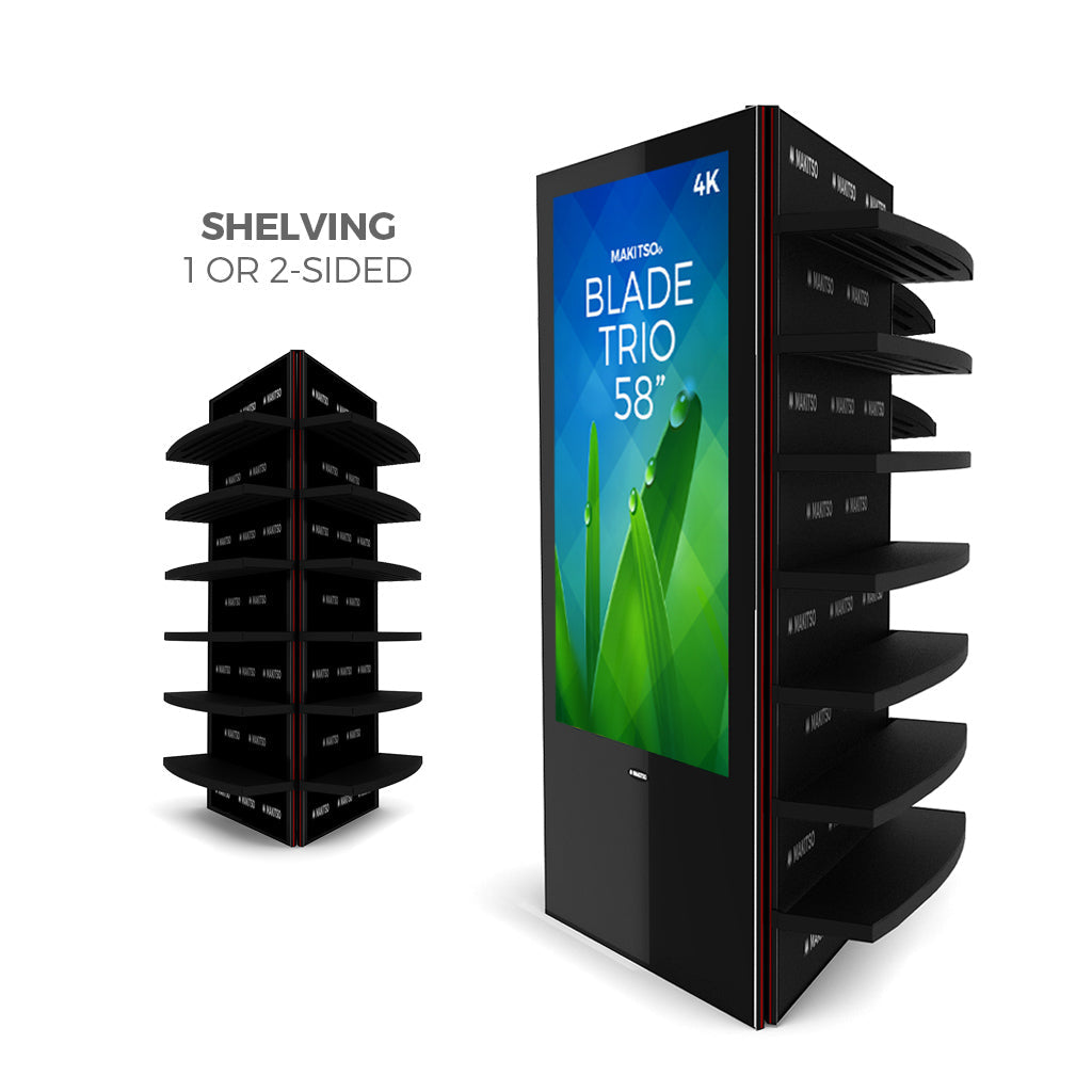 Discover the Makitso Blade Trio digital signage kiosk with add-on touch screen display solutions and create a lasting impression in the mind of your audience through personal interactive experiences. Add-on shelves for retail merchandising and product showcase.