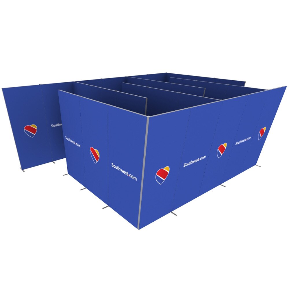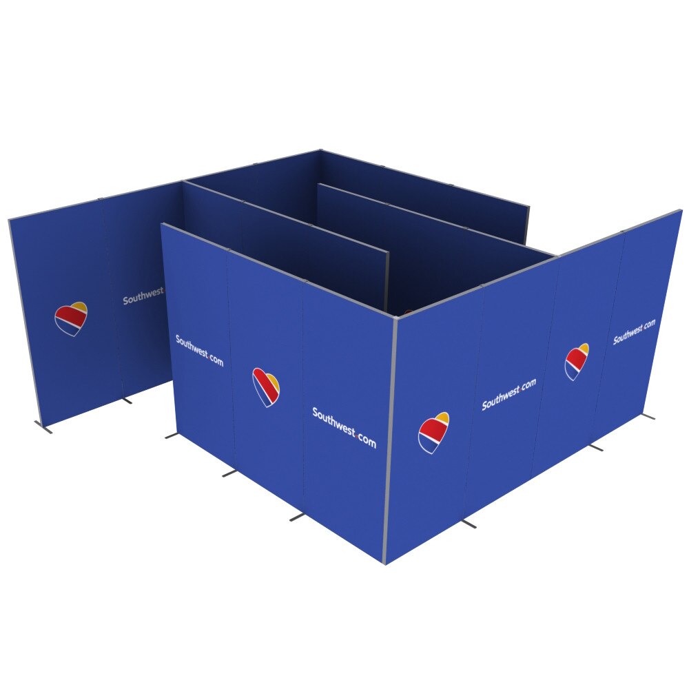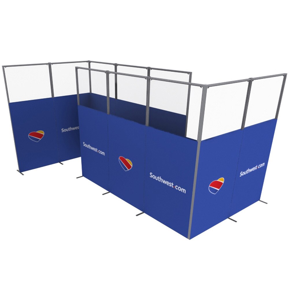 With many wall sizes and connector accessories, effortlessly create numerous configurations that meet your needs. Connector options are either 2 way (90°) or 4 way (180°). Available with edge-to-edge custom printed dye sublimated graphics, TPU plastic for hygienic sneeze guards and partitions or as standard stock white SEG material. Included padded travel bags keep your frames and graphics protected during transport and storage.