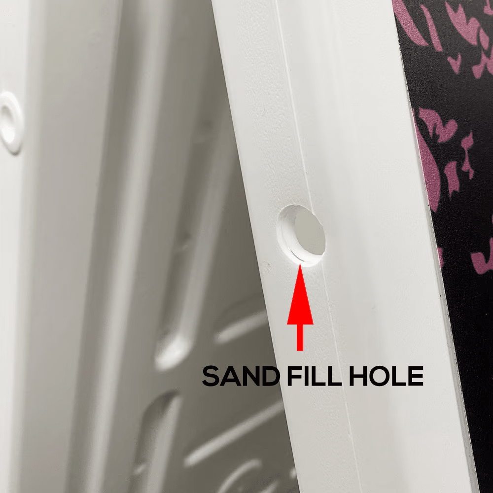The Signicade Deluxe is a hard-working, heavy-duty, all-purpose sign frame. This classic A-frame sign can display two 24" x 36" coroplast graphics, one on the front and the other on the back. Graphics simply just slide into the frame with tabs on the left and right sides that hold your graphic in place. Each sign frame has four fill holes (two on each side of the frame) that allow you to add sand to give your Signicade extra weight for use outdoors. Simply remove plugs from fill holes and fill each hole with sand. Up to 2.5 lbs. of sand per hole for a total of 10 lbs of added weight. If you'd like to produce your own graphics these accept any rigid materials up to 3/16" thick.